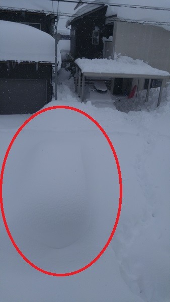 左側の道は屋根雪でつぶれていて、裏手も雪山が。はさみうちでどこにも行けず・・・
