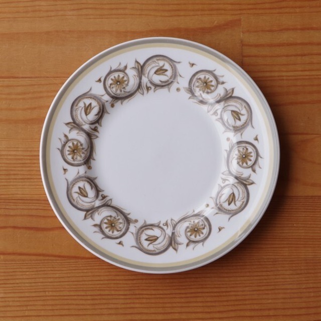 スージークーパーのデザートプレートです。 Venetia(ベネチア)という名前のモデルで、 リム部分にグレージュを基調としたS字型の花や葉の絵柄が入っています。 ヨーロッパのデザートプレートとしてはやや小さめのサイズです。 1960年代ごろのものと思われます。 状態に関して、特に目立つチップやヒビはありません。 わずかな擦り傷はあるかと思いますが、 全体として傷は少なく、ツヤがあり、ヴィンテージ品としてはとてもきれいな状態です。 製造時からあるエラーとして、ちょっとした色汚れや色むら、黒点等はある場合があります。 詳細は写真にてご確認ください。 こちらの商品は、複数在庫がございます。 状態が同等ですので一商品として販売しております。 写真に写る2枚のうちの1枚をお送りいたします。 ご了承ください。 --- ■サイズ: 直径約 16.6cm ※ 写真に写りこんだデコレーションはお届け内容に含まれません。 ◆ スージークーパー 商品一覧 https://flohmarkt.thebase.in/categories/288976