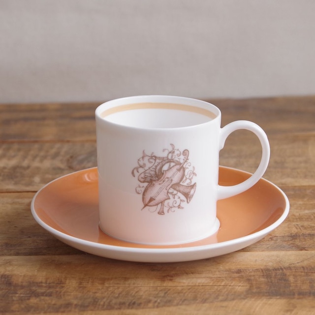 スージークーパー ミュージカルインスツルメンツ 楽器モチーフ コーヒーカップ ソーサー Susie Cooper Musical Instruments #241018-2 アンティーク ヴィンテージ 食器 陶器 レトロ バイオリン ホルン ラッパ オレンジ色