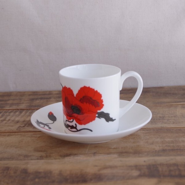 スージークーパーのコーヒーカップ&ソーサーです。 バックスタンプはウェッジウッドのものです。 赤いひなげしの絵柄が情熱的に描かれています。 フリルのような花びらが華やかで、 可憐さと迫力を併せ持ったインパクトのある絵柄です。 1970年代ごろのものです。 状態に関して、特に目立つチップやヒビはありません。 わずかな擦り傷はあるかと思いますが、 全体として傷は少なく、ツヤがあり、 ヴィンテージ品としては非常にきれいな状態です。 製品本来の品質として、ちょっとした色むら、色汚れ、黒点、不整形等はある場合があります。 詳細は写真にてご確認ください。 こちらの商品は複数在庫がございますが、 状態に特に差がありませんので一商品として販売しております。 写真に写る5客のうちの1客をお送りいたします。 ご了承ください。 --- ■カップ: 高さ約 7.4cm 口径約 7.3cm ■ソーサー: 直径約 14.6cm ※ 写真に写りこんだデコレーションはお届け内容に含まれません。 ◆ スージークーパー 商品一覧 https://flohmarkt.thebase.in/categories/288976
