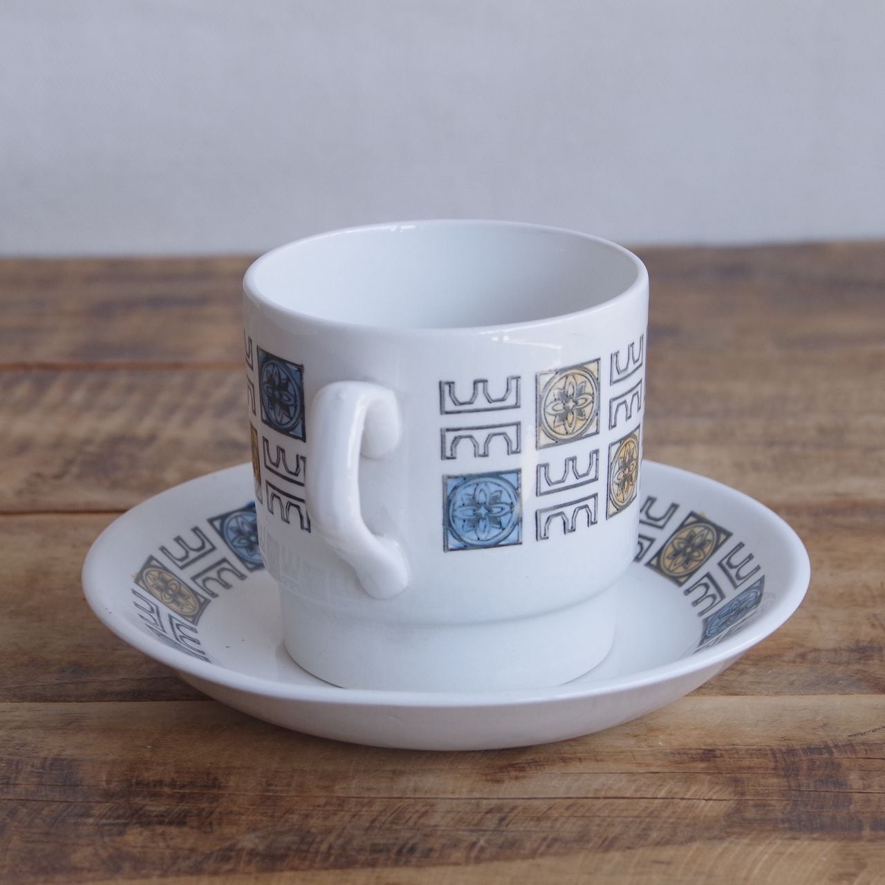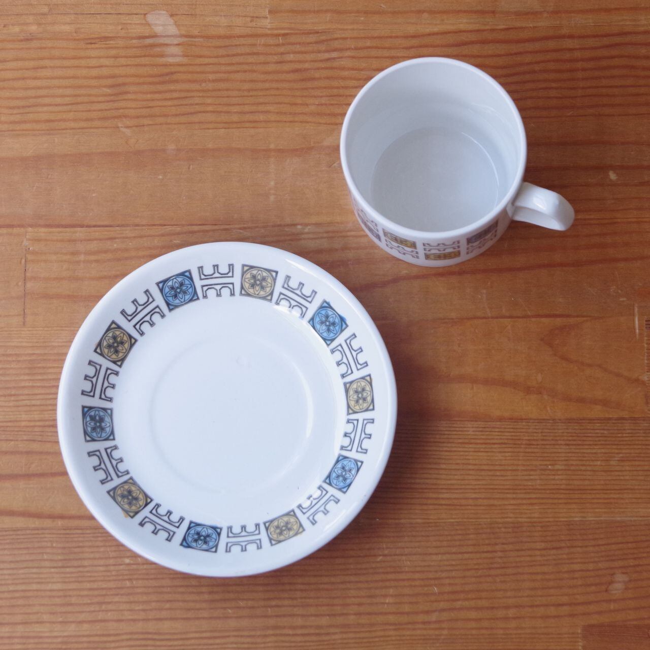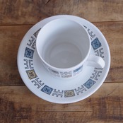 ビルトンズ オレンジ ブルー 花柄 幾何学模様 コーヒーカップ ソーサー レトロモダン Biltons Staffordshire #250309-2 イギリス ヴィンテージ 食器 陶器 ミッドセンチュリー カップ&ソーサー スタッキング