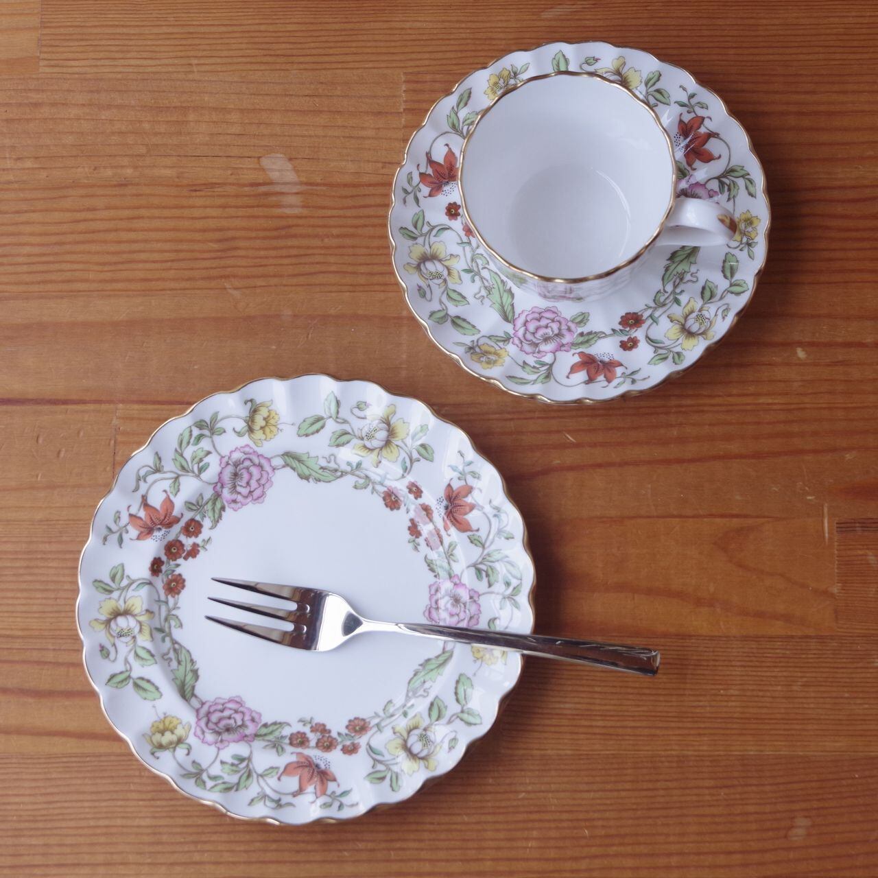 リム部分にピンクや赤、黄色の花の絵柄が入っており、マットゴールドのふちどりが入っています。