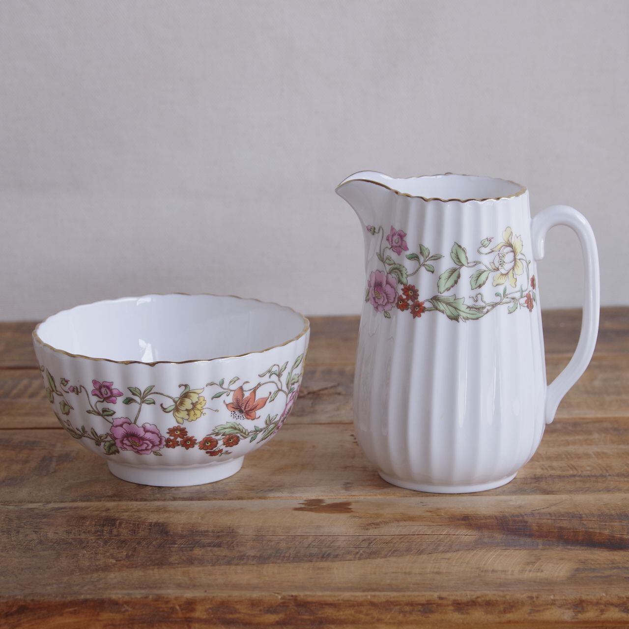 側面にピンクや赤、黄色の花の絵柄が描かれ、マットゴールドのふちどりが入っています。