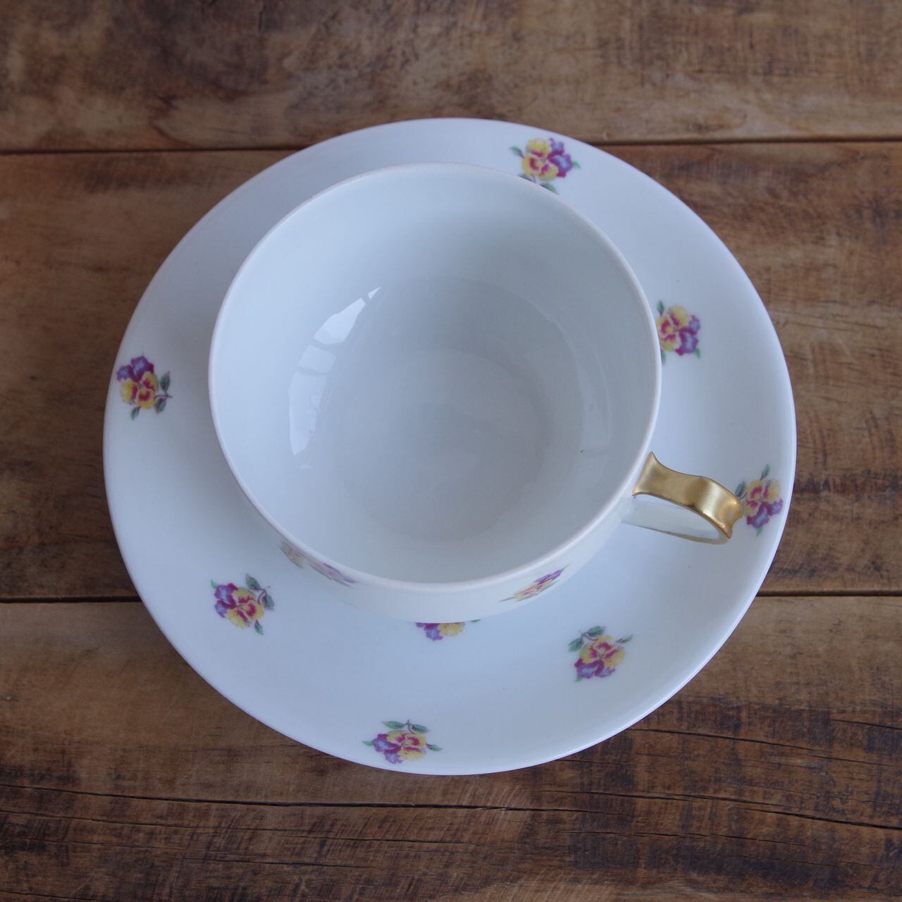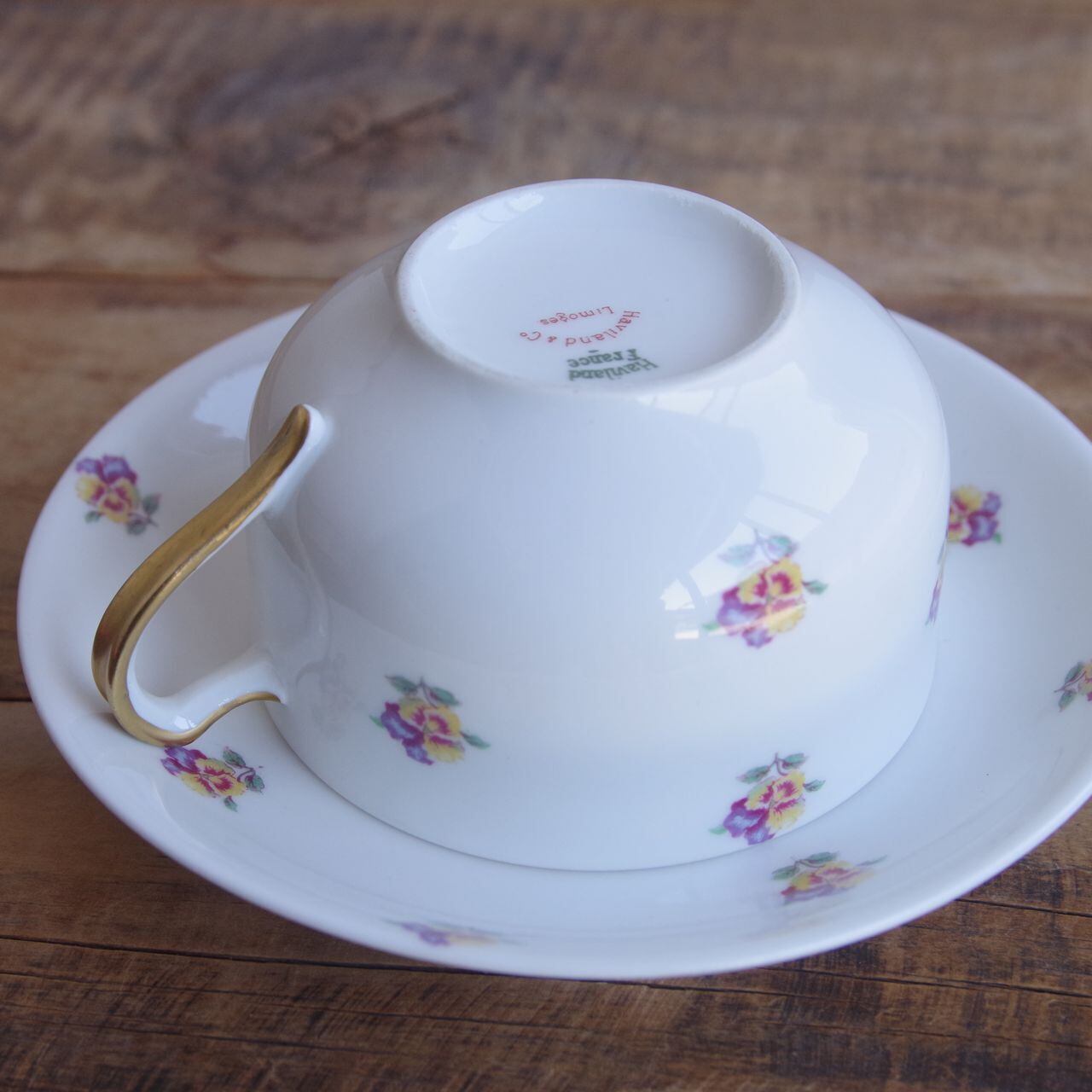 Haviland Limoges リモージュ アビランド パンジー 花柄 ティーカップ&ソーサー #250331-1 ゴールド 金彩 フランス アンティーク 食器 陶磁器 陶器 かわいい お花 コーヒーカップ