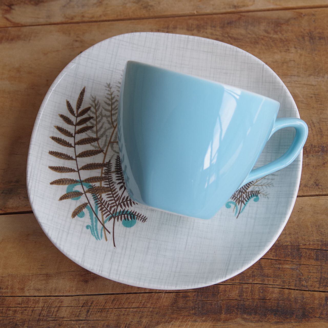 J&G ミーキン ブルー 羊歯 コーヒーカップ&ソーサー Meakin Rock Fern #250414-12~14 イギリス ヴィンテージ 食器 陶器 レトロ ミッドセンチュリー 四角 ボタニカル柄 小さめ