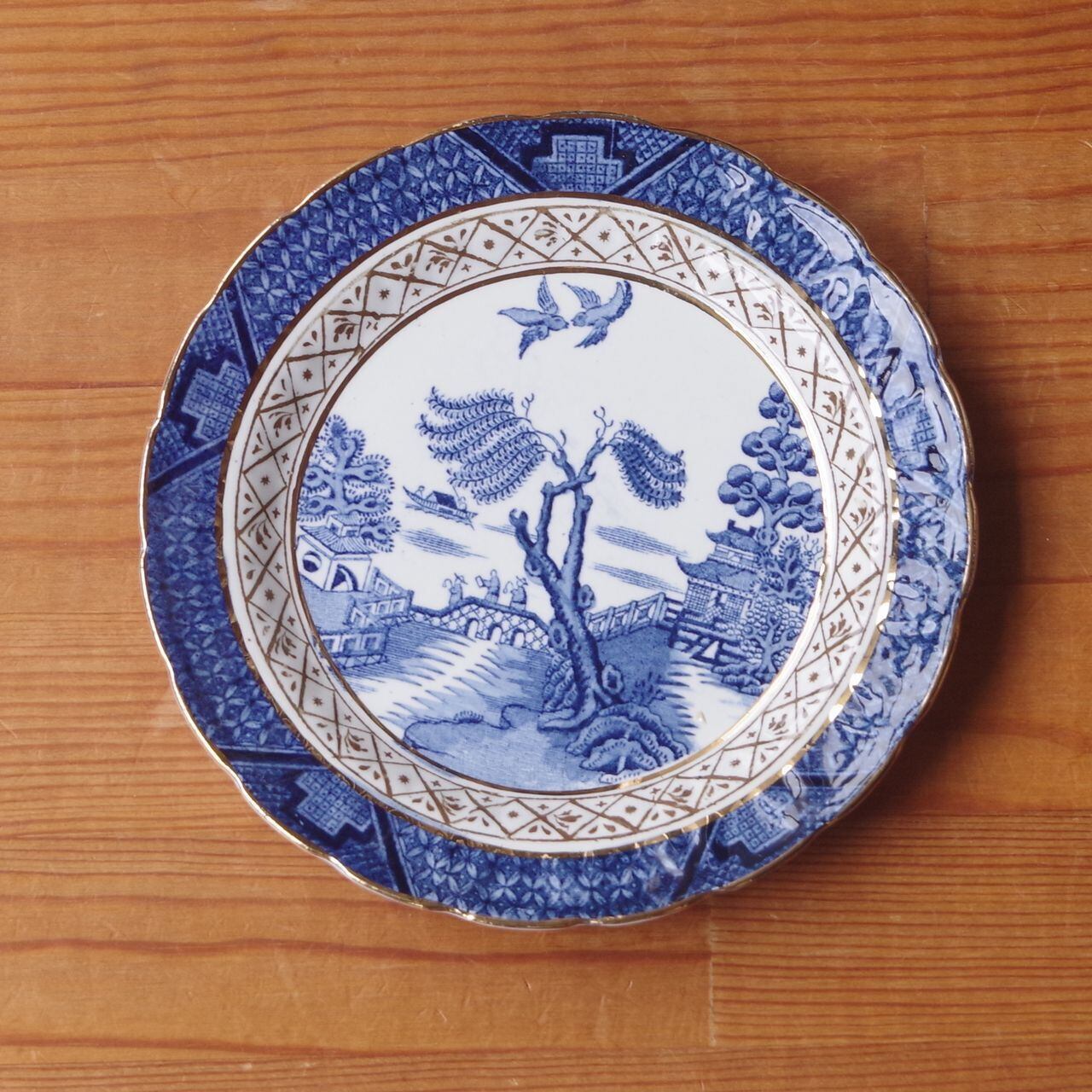 柳の木や中国風の建物、鳥がコバルトブルーで描かれており、ゴールドのラインやふちどりが入っています。