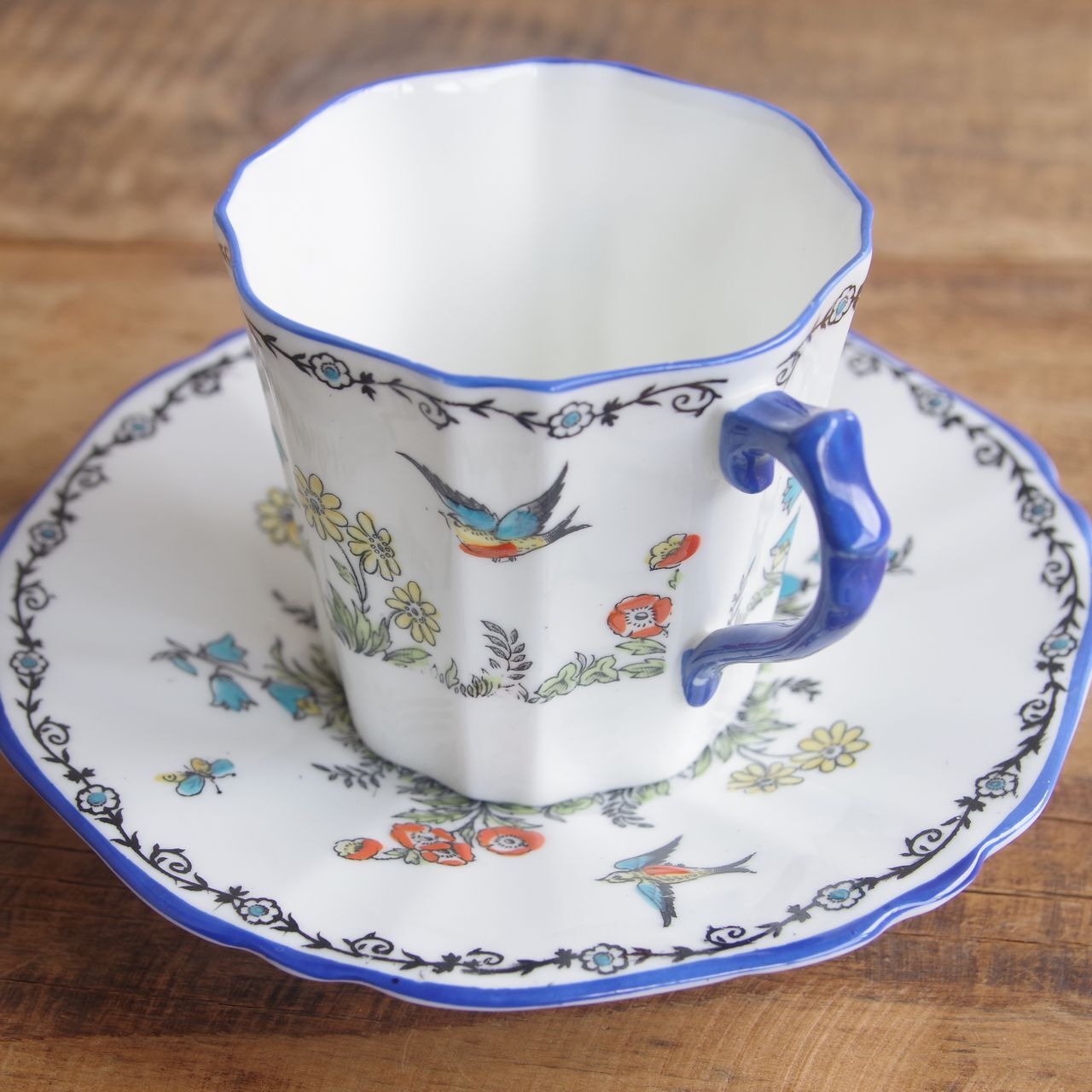 コーリングウッド つばめ 鳥 花 蝶 コーヒーカップ&ソーサー Collingwood イギリス アンティーク食器 #250425-1 陶磁器 アールデコ レトロ ブルー ティーカップ ヴィンテージ