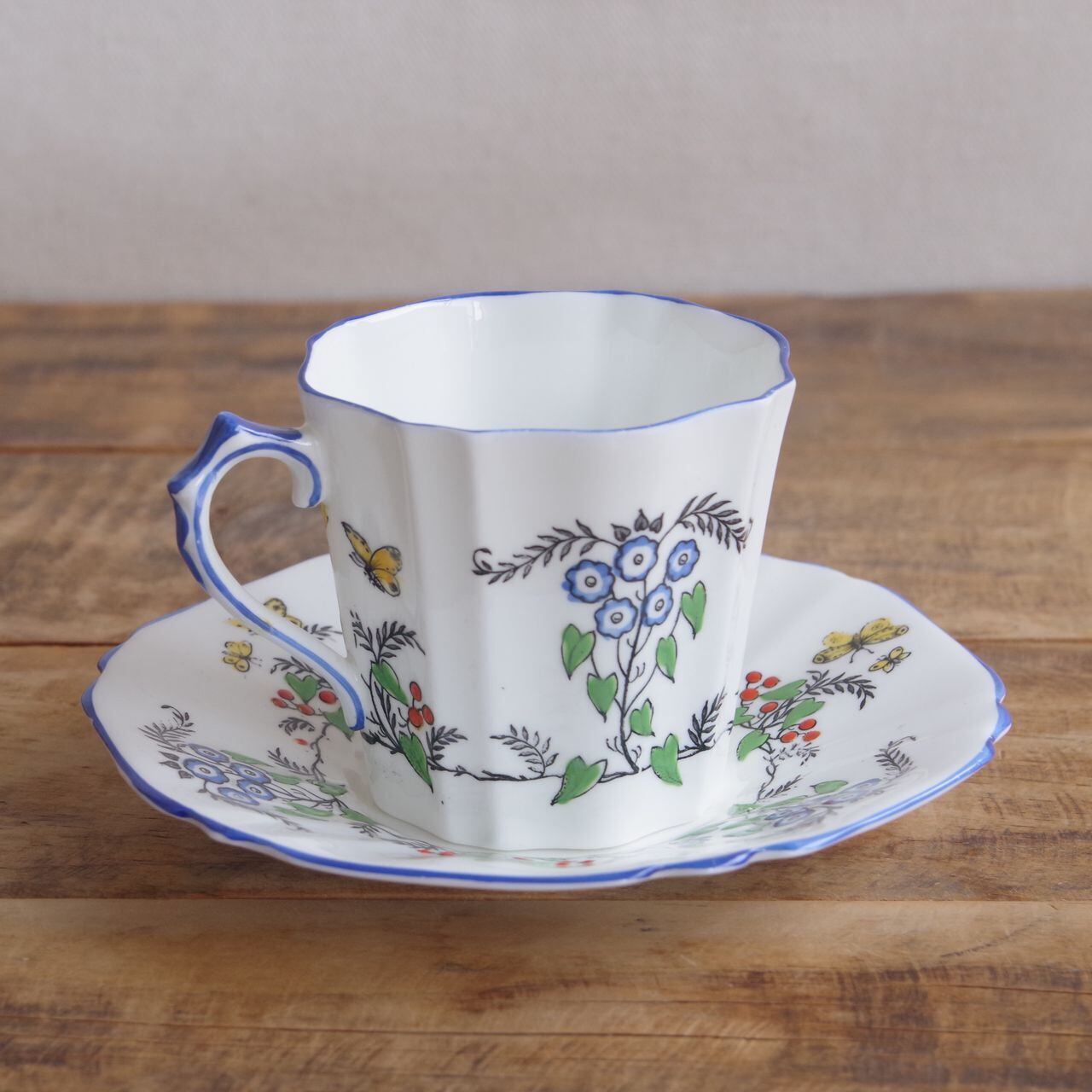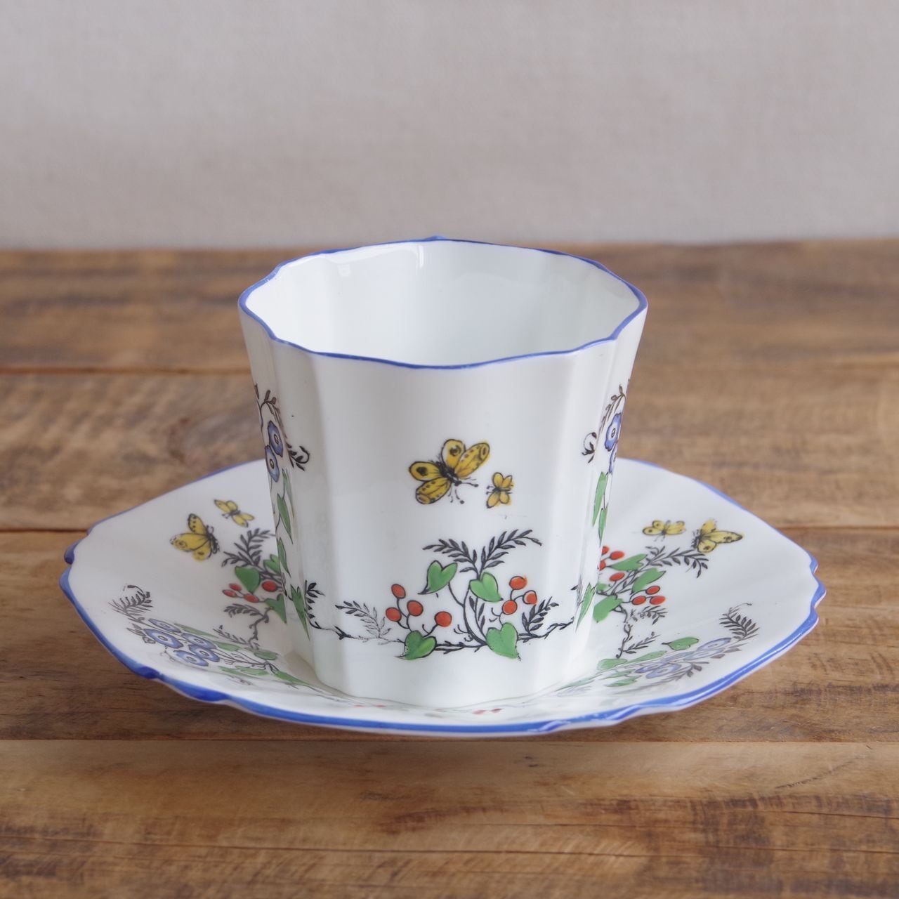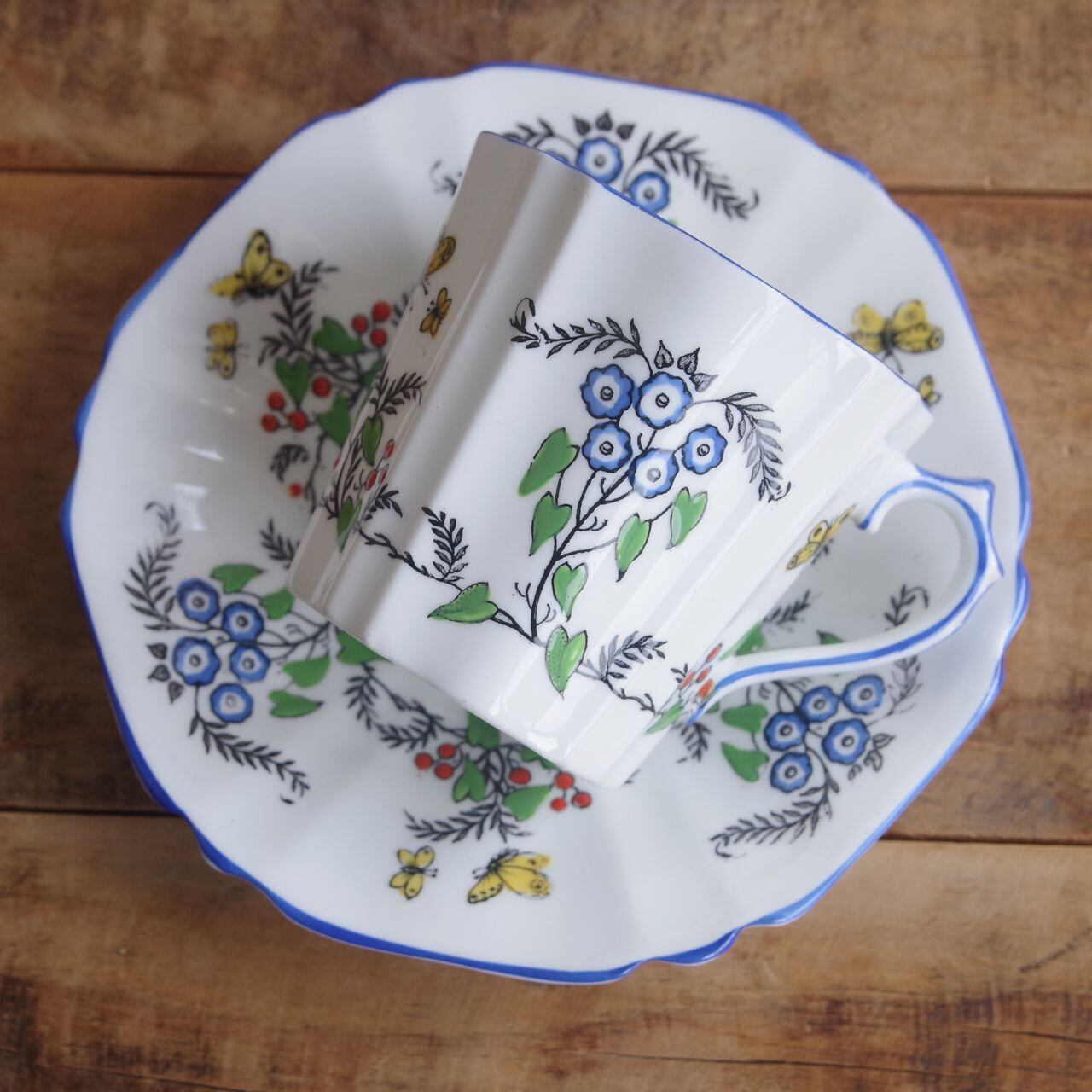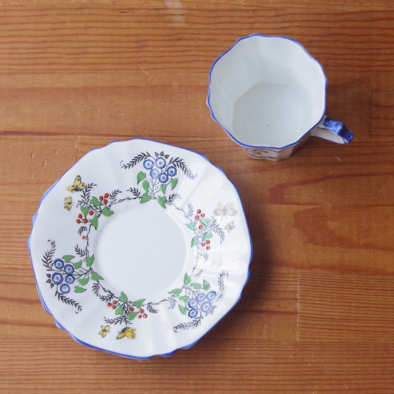 コーリングウッド 蝶 ツタ 花柄 コーヒーカップ&ソーサー Collingwood #250425-6 アンティーク食器 イギリス ヴィンテージ 陶器 レトロ ブルー 赤い実 青 アールデコ