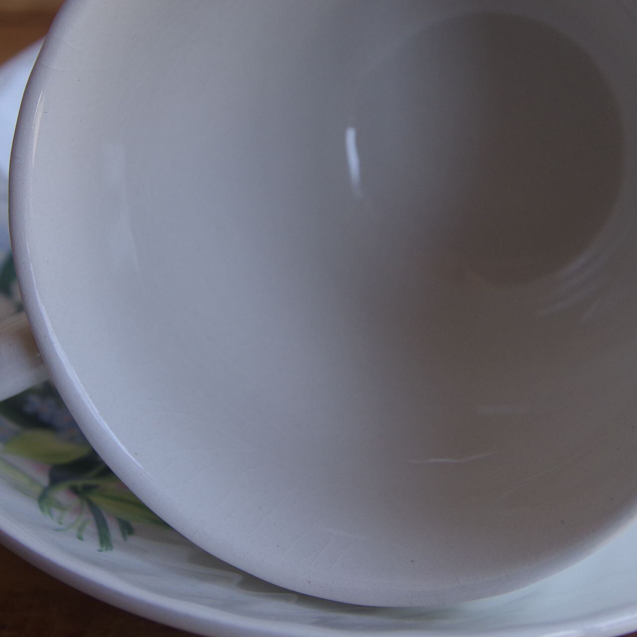 使用によるダメージではありませんが、ソーサーふちに一か所、地の陶器のカケがあります。