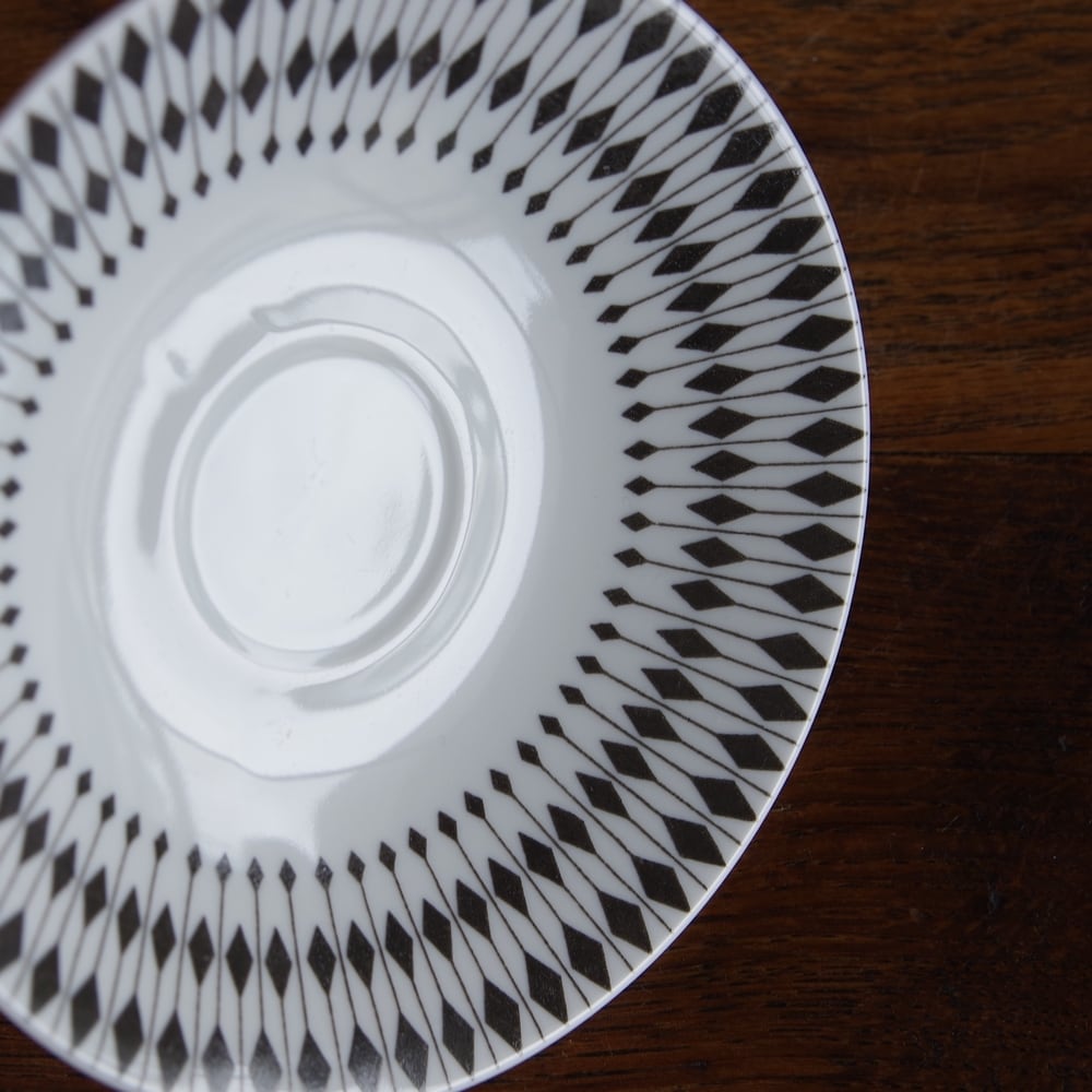 ソーサーのリム部分には、放射線状にダイヤ柄のような模様が入っています。