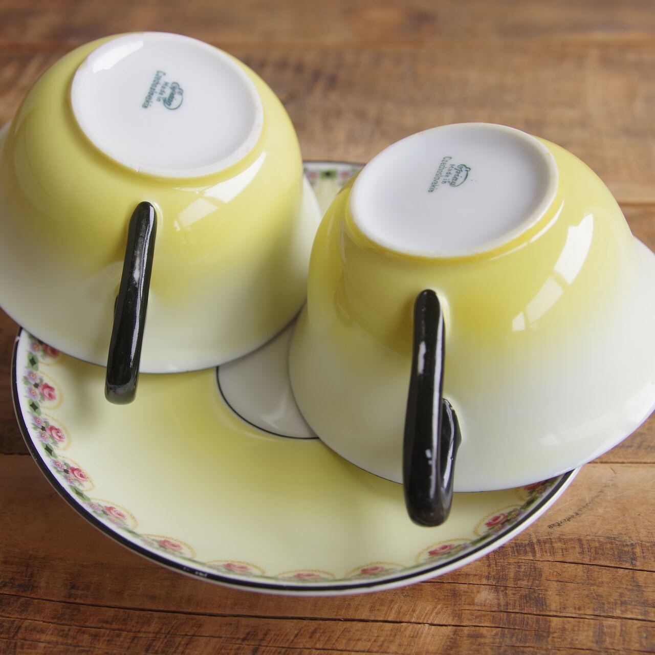 2個セット エピアグ 黄色 グラデーション 薔薇 花柄 ティーカップ (ソーサーなし) オマケ付き アンティーク食器 チェコスロバキア製 Epiag #250526 ヴィンテージ 黒 レトロモダン アールデコ おしゃれ 東欧 雑貨