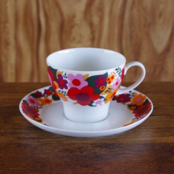 ソーサーにも同様の赤系のレトロな花柄が入り、