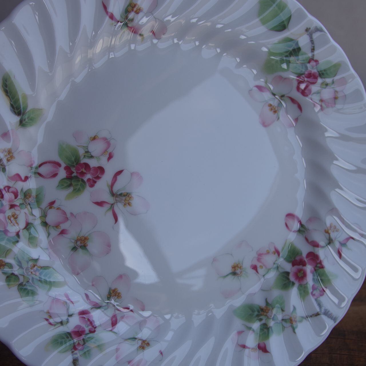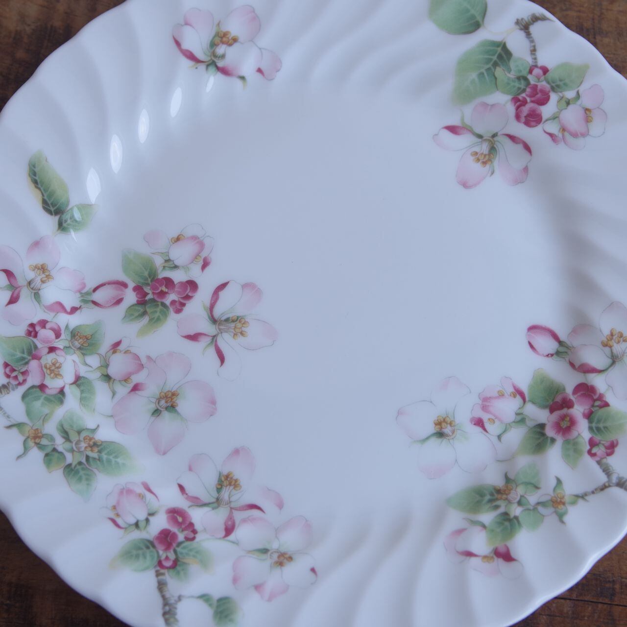 リム部分にドレープのようなレリーフが入っており、淡いピンク色のリンゴの花が描かれています。