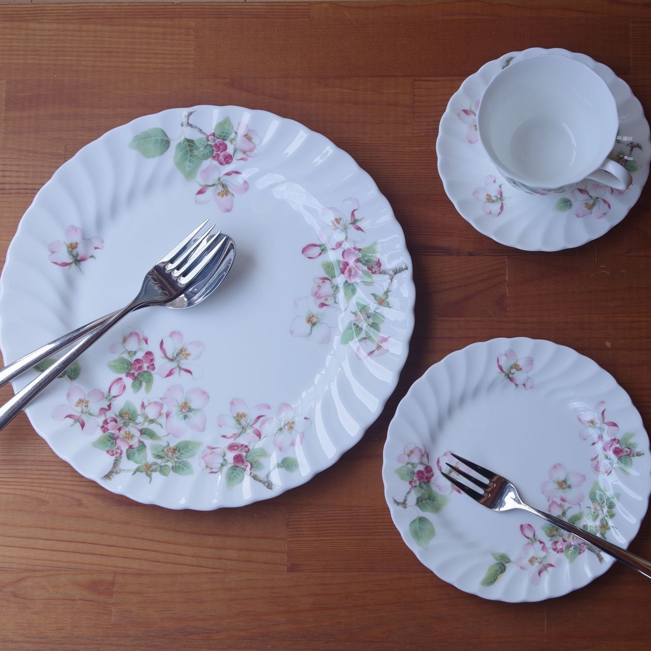 リム部分にドレープのようなレリーフが入っており、淡いピンク色のリンゴの花が描かれています。