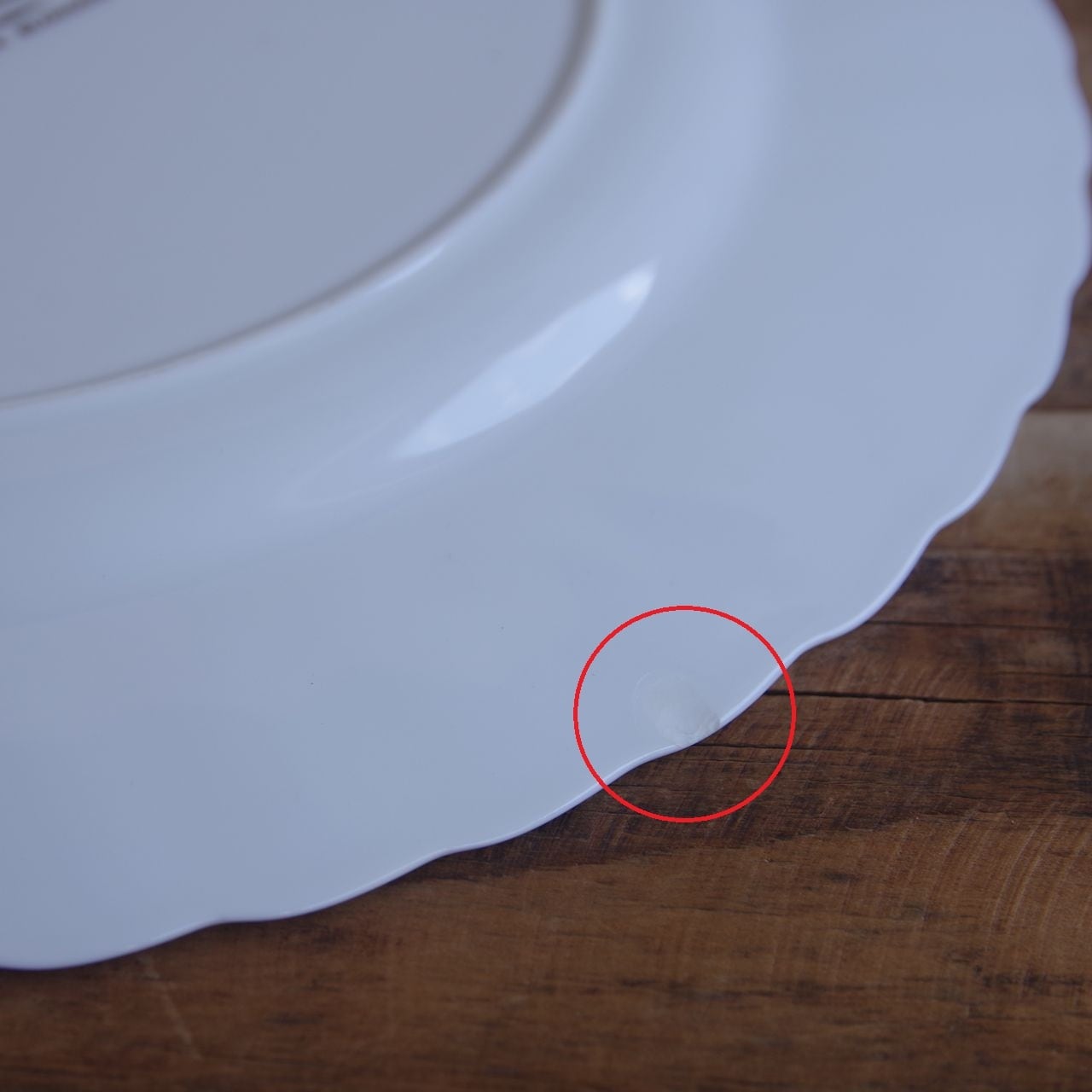 裏側のふちに一か所、薄くかけている箇所がありますので、ご購入を検討される場合には写真をよくご確認ください。