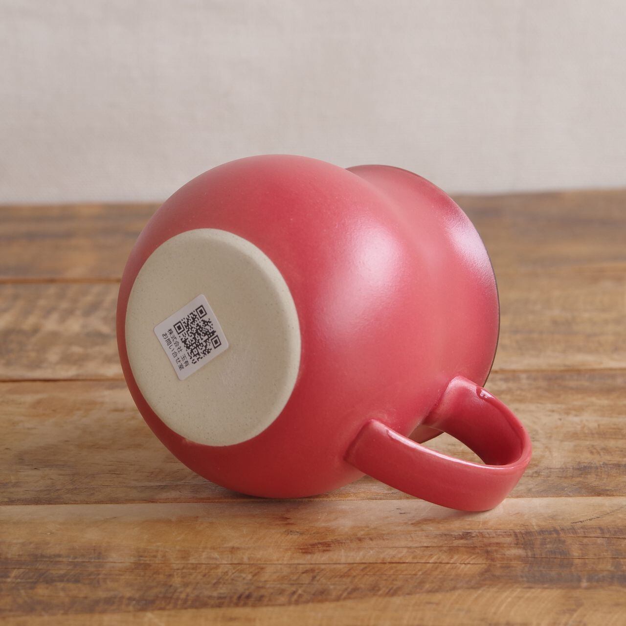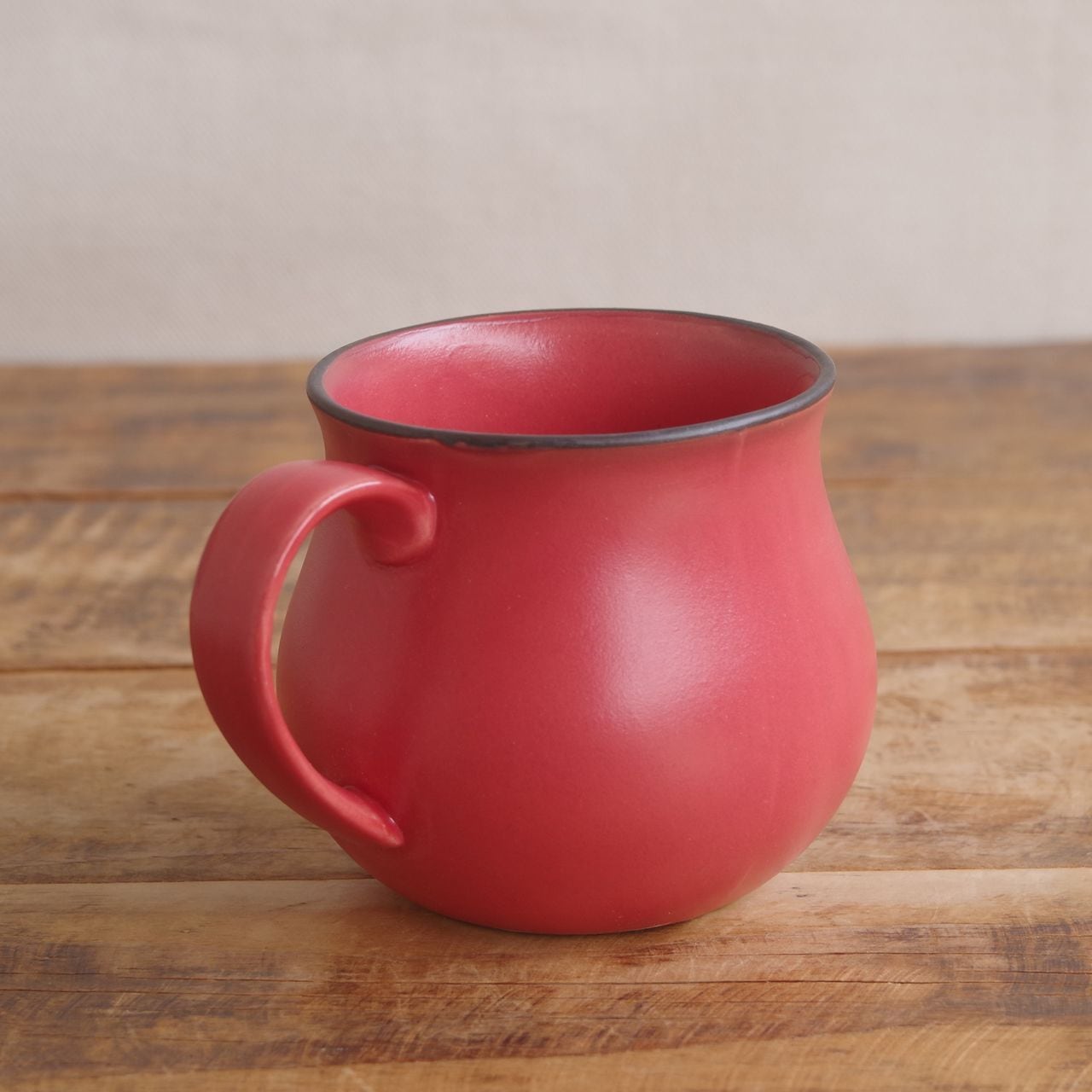 マットで深みのある赤の釉薬で、ふちの部分にのみ黒っぽい色が入っています。