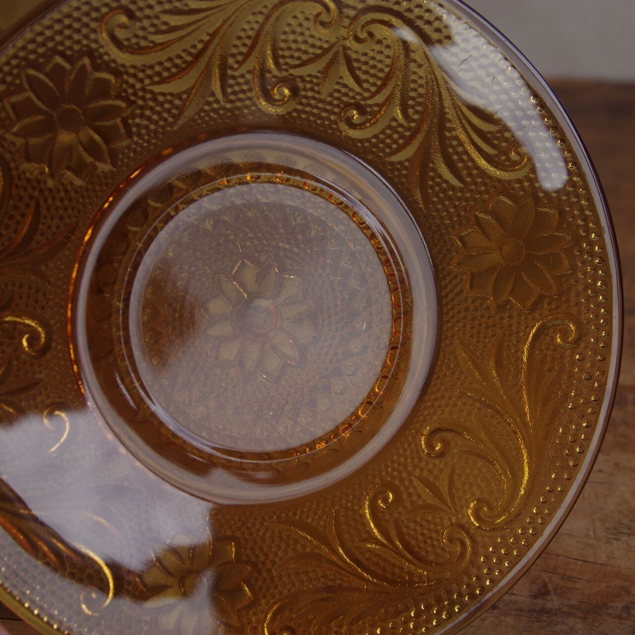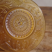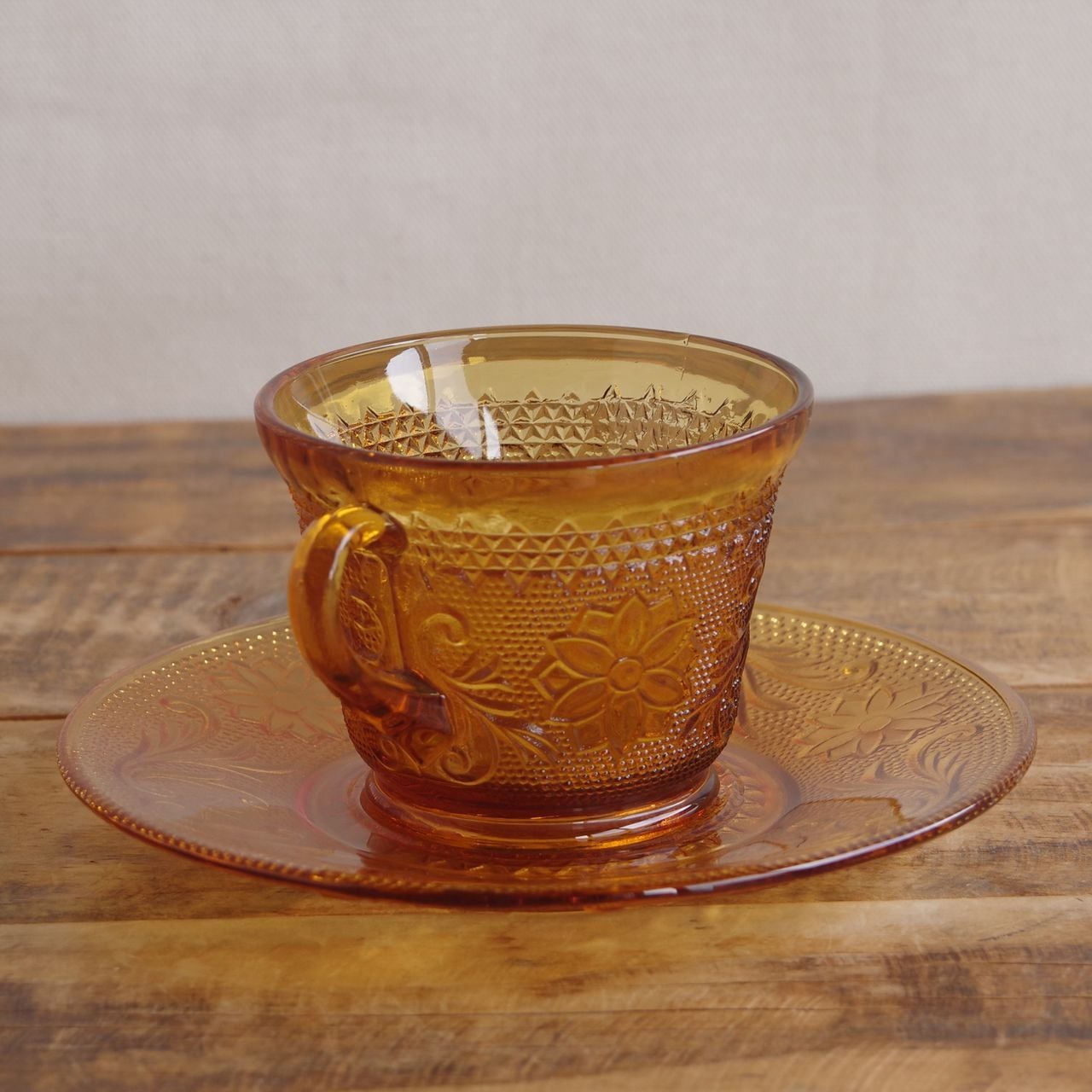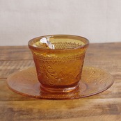 琥珀色のガラスで、ボタニカル柄のレリーフが型押しされたレトロな雰囲気のカップです。
