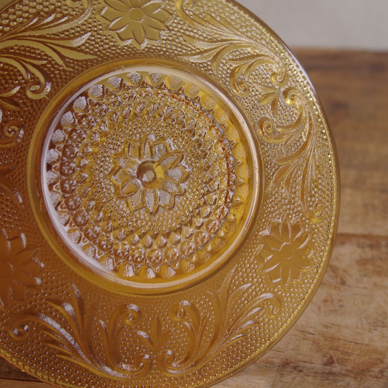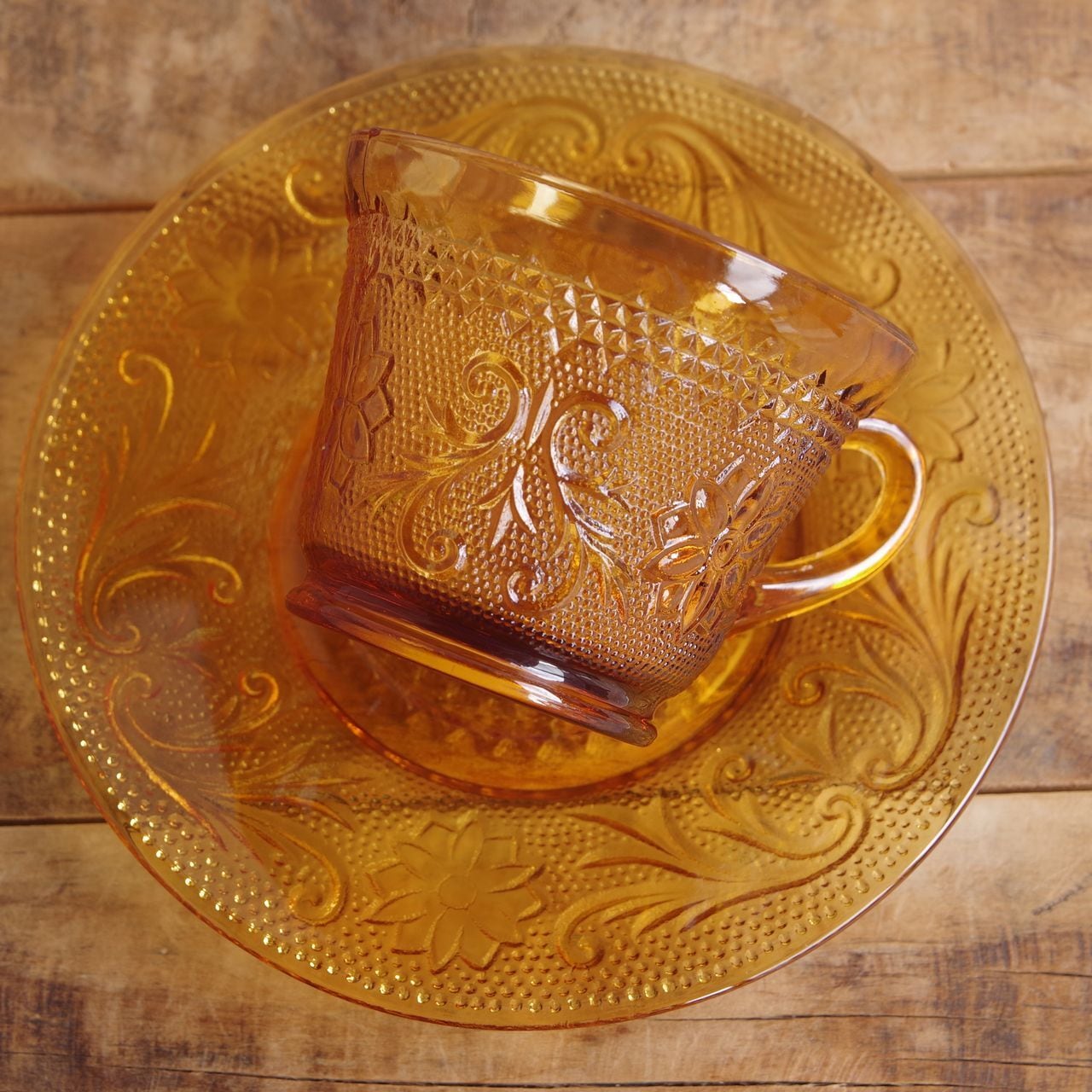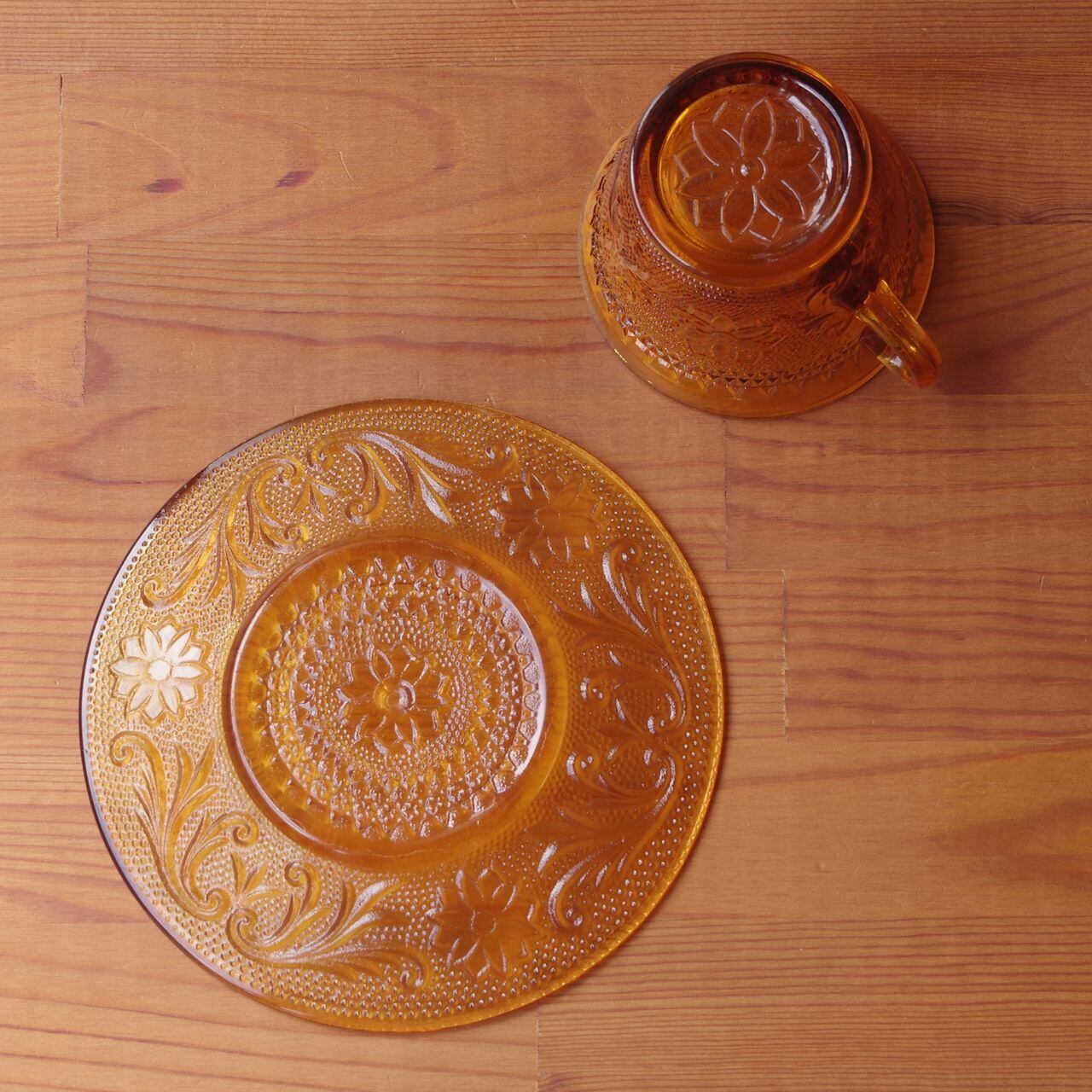 アメリカ製 ティアラ サンドウィッチ アンバー ガラス カップ&ソーサー ヴィンテージ 食器 Tiara Sandwich Yellow Mist #250904-1 Made in U.S.A. レトロ プレスガラス 花柄 レリーフ ブラウン コーヒーカップ ティーカップ