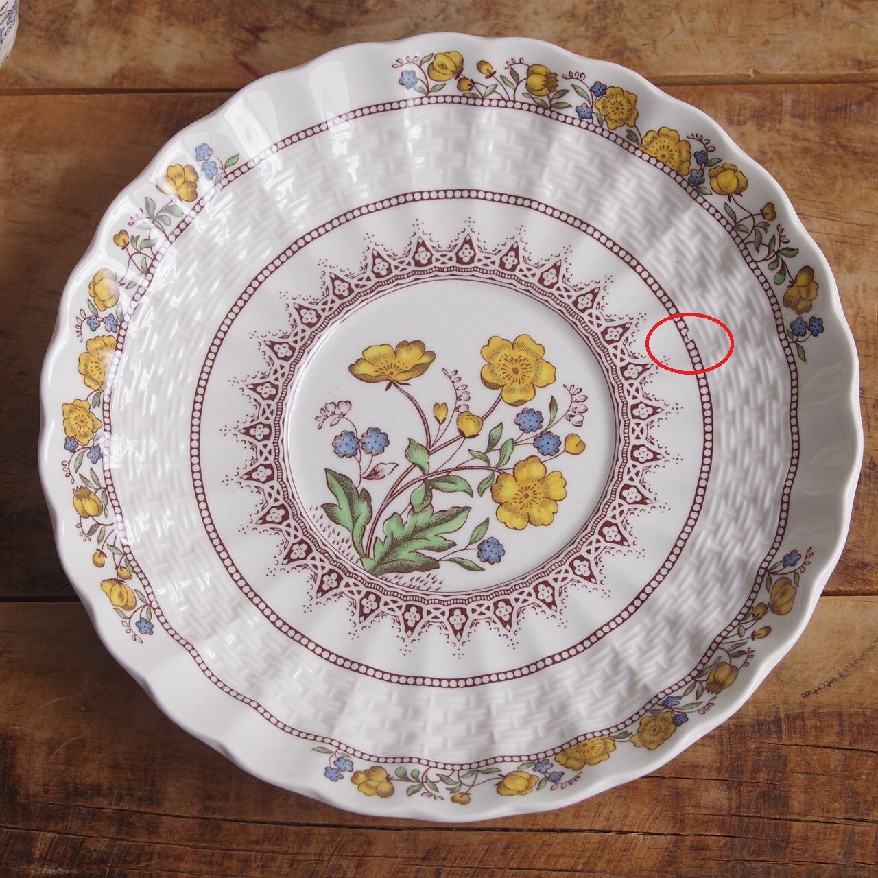 ふちが花びらのような形になっており、一部、帯状に籠を編み込んだようなレリーフが入っています。