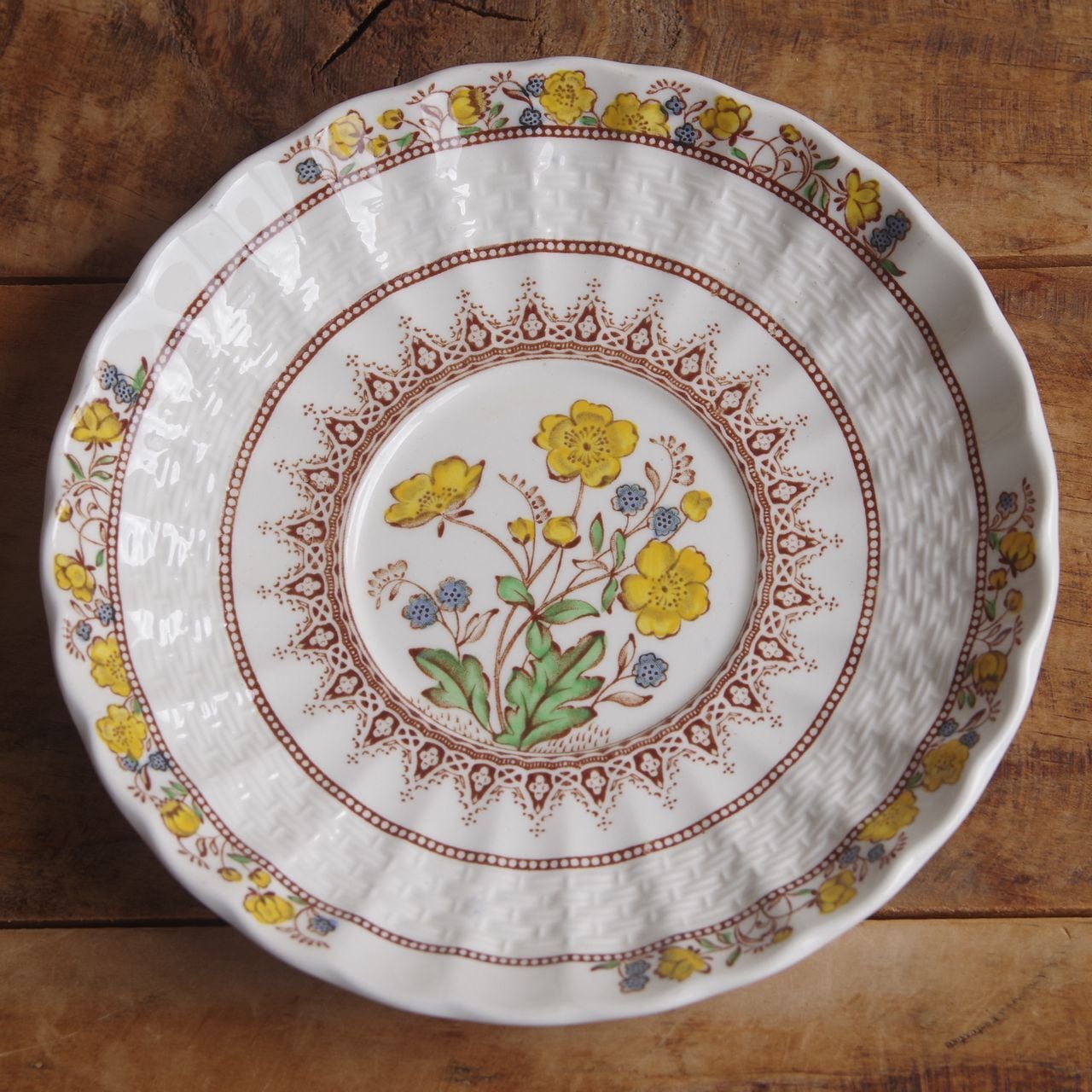 ふちが花びらのような形になっており、一部、帯状に籠を編み込んだようなレリーフが入っています。