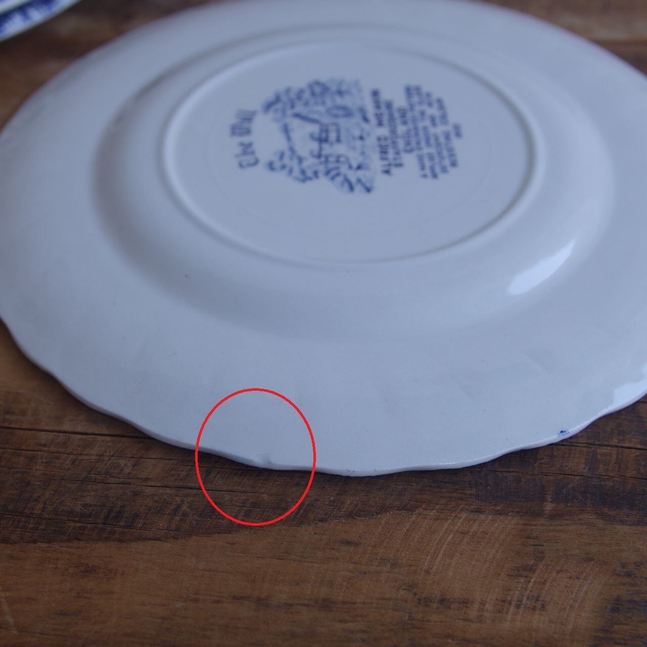 もう1枚のお皿の裏側ふちには、製造時にできた地の陶器の小さなへこみがあります。