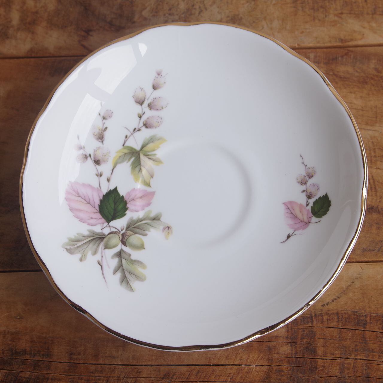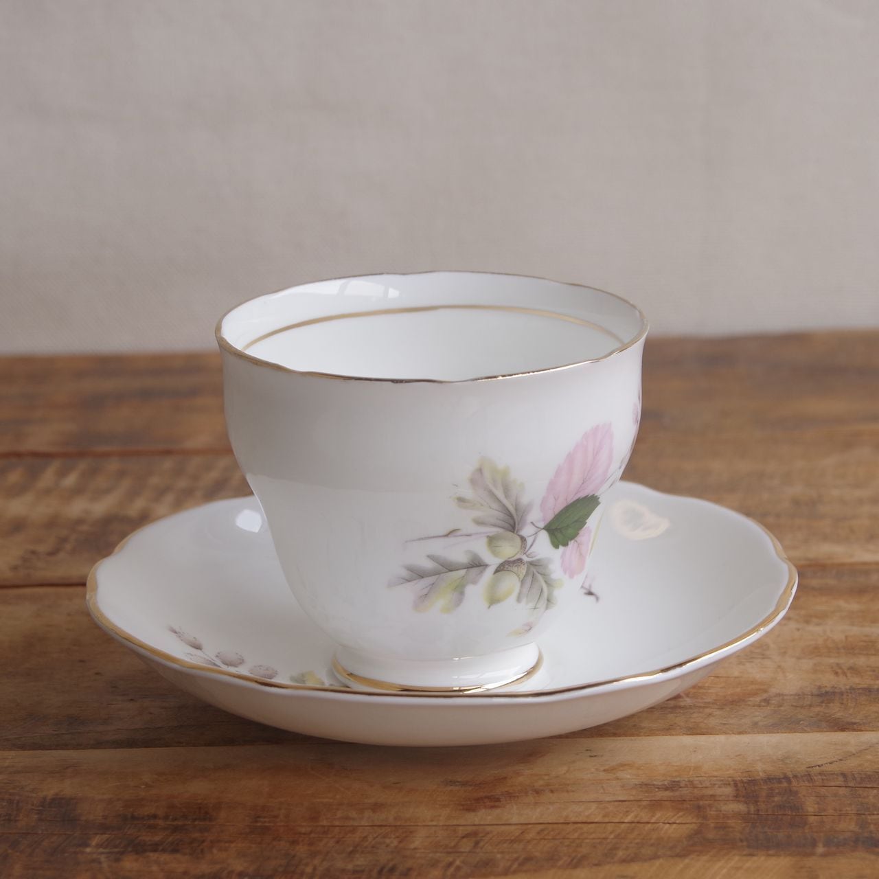 小さな脚のついたカップで、どんぐりと、ネコヤナギのような丸い花をつけた枝が描かれたレトロなデザインです。