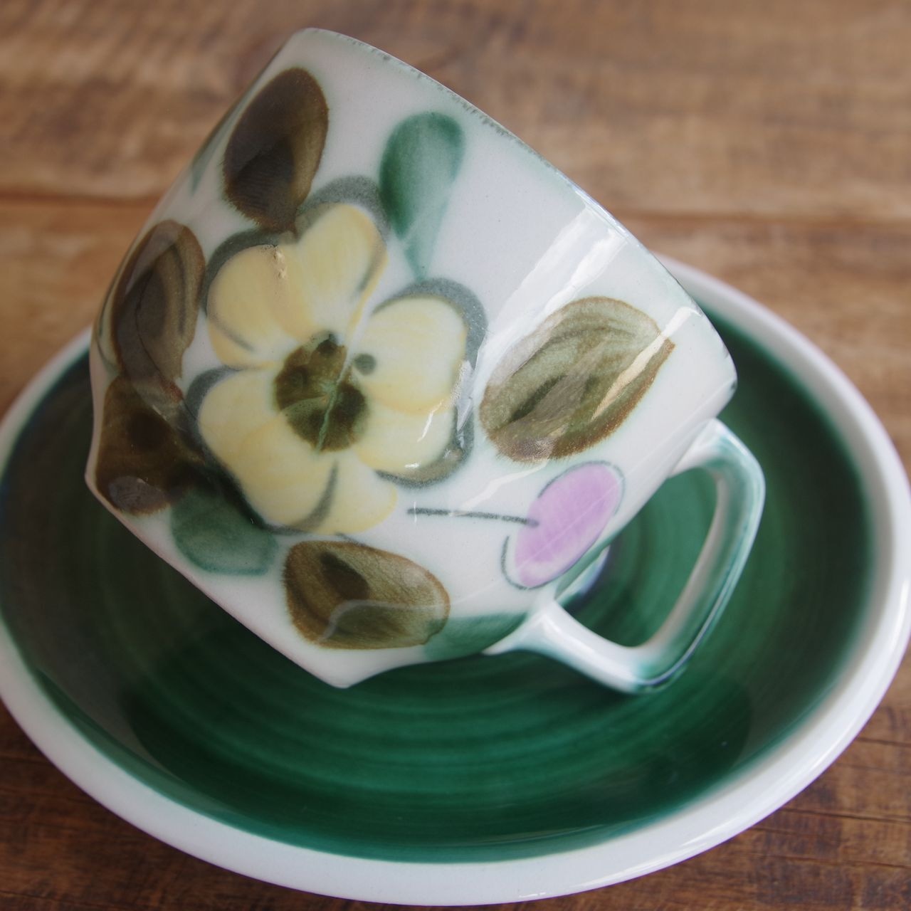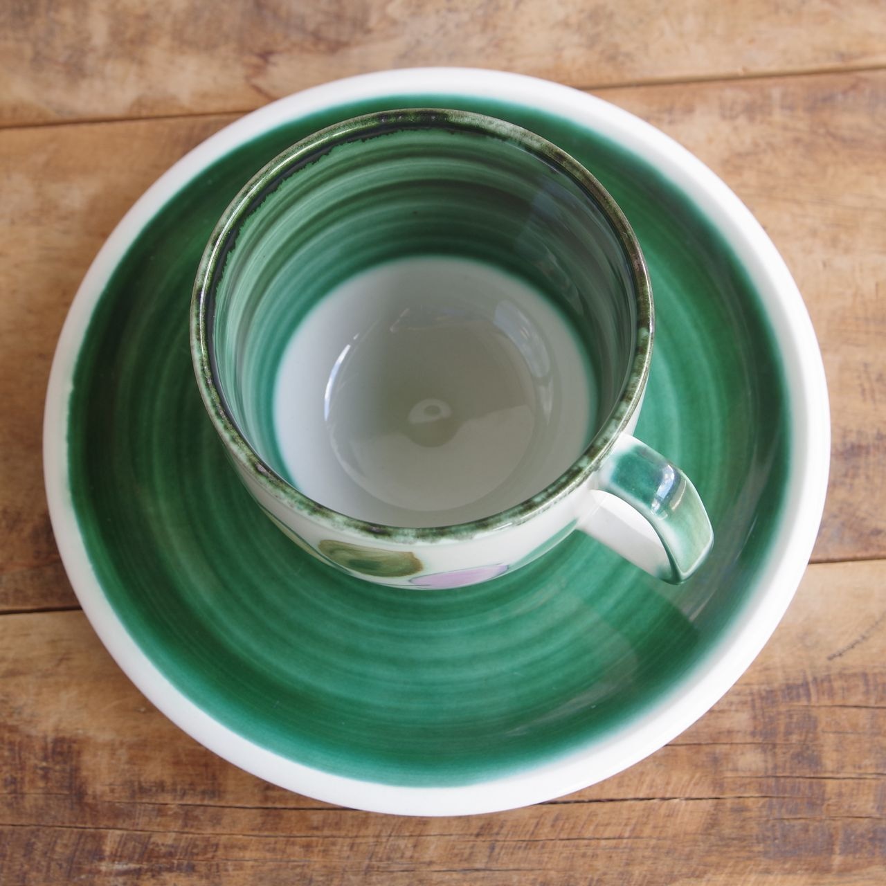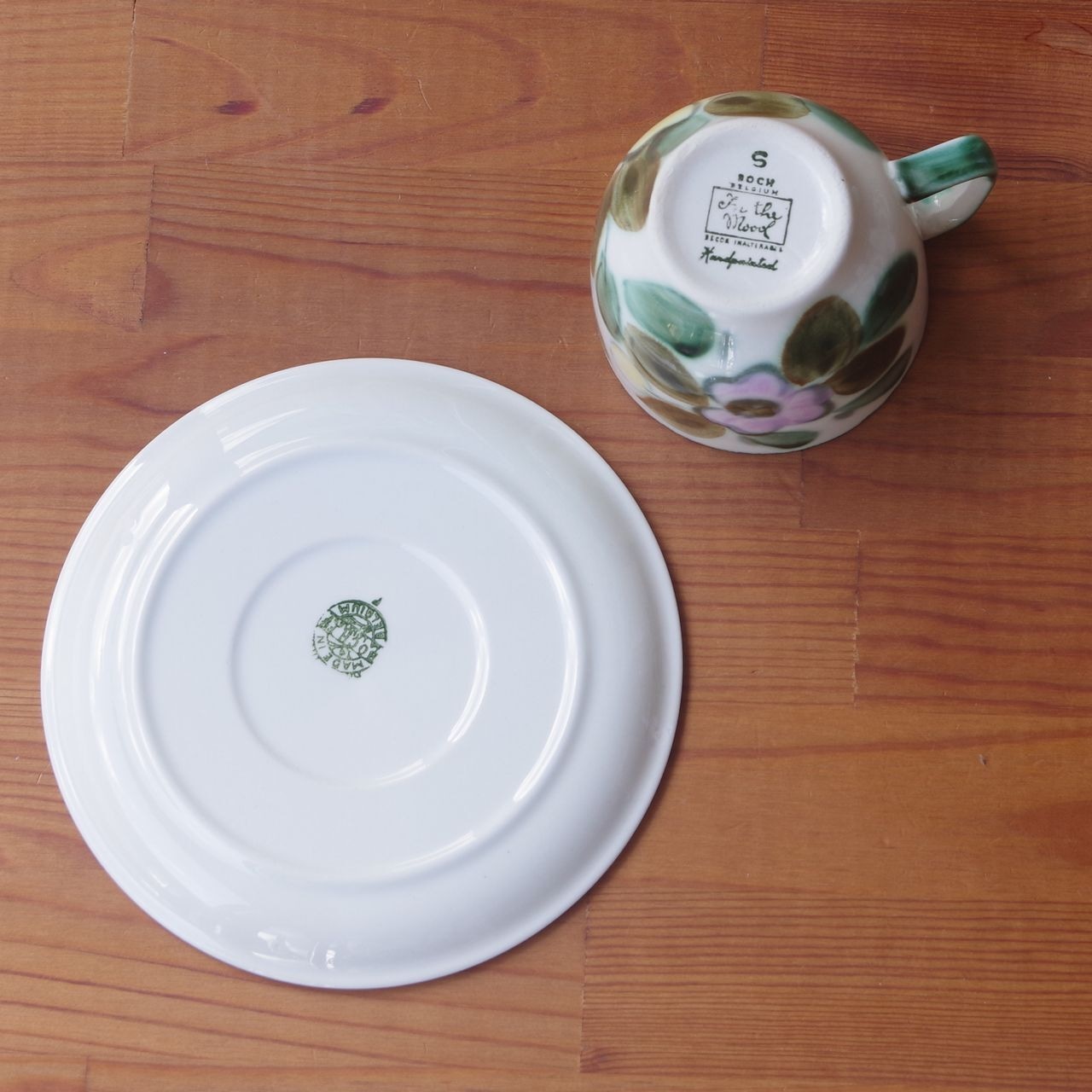 ベルギー製 ボッホ インザムード Boch In the Mood 手描き 花柄 コーヒーカップ&ソーサー #251001-02 ヴィンテージ 食器 陶磁器 Belgium レトロ ロイヤルボッホ キッチン 雑貨 ティーカップ CS デュオ グリーン ピンク 黄色 かわいい