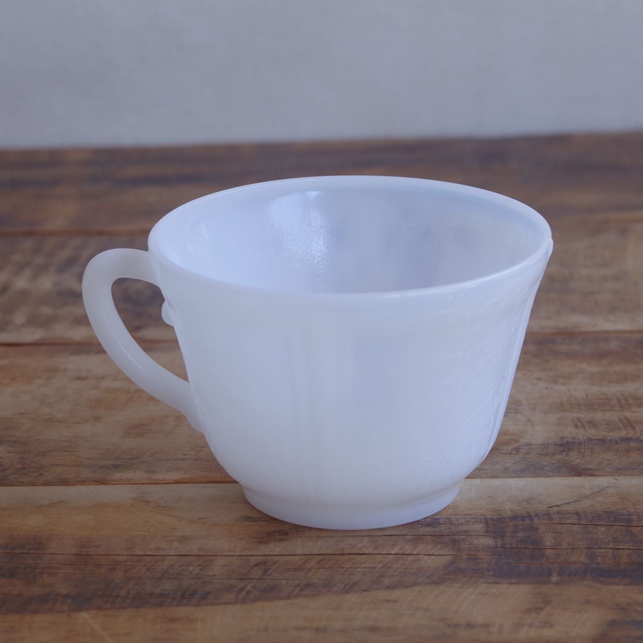 白いガラス製のティーカップで、外側の面にダマスク柄のような繊細なレリーフが入っています。