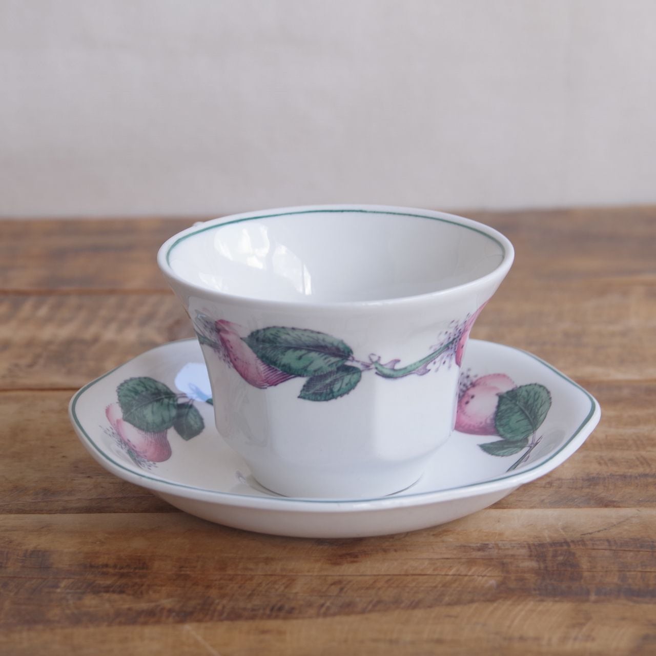 ピンク色の実のような絵柄が入っており、ふちにグリーン色のラインが入っています。