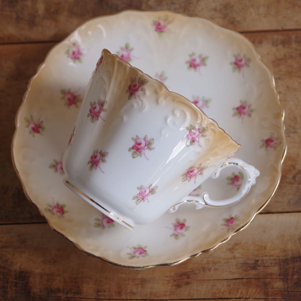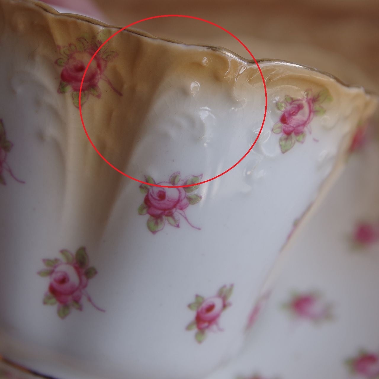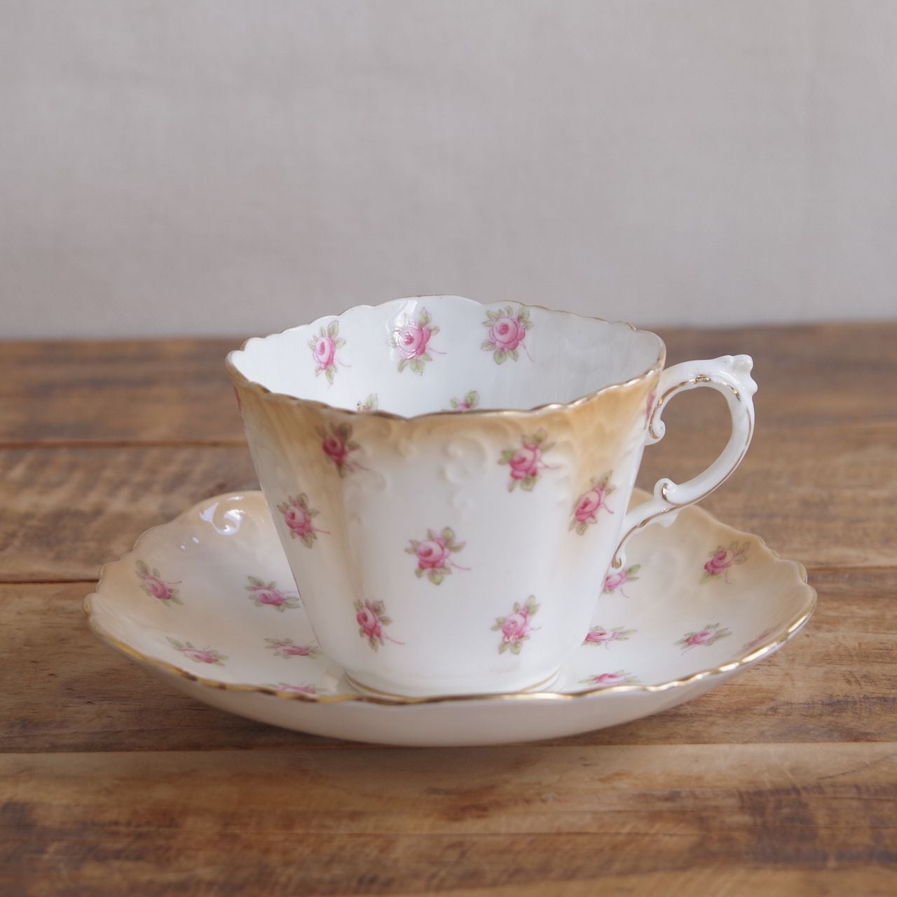 カップの内側も含めて、ピンク色の薔薇の花が散らされており、ふちにはスプレーで吹きかけたようなオレンジ色が塗られています。