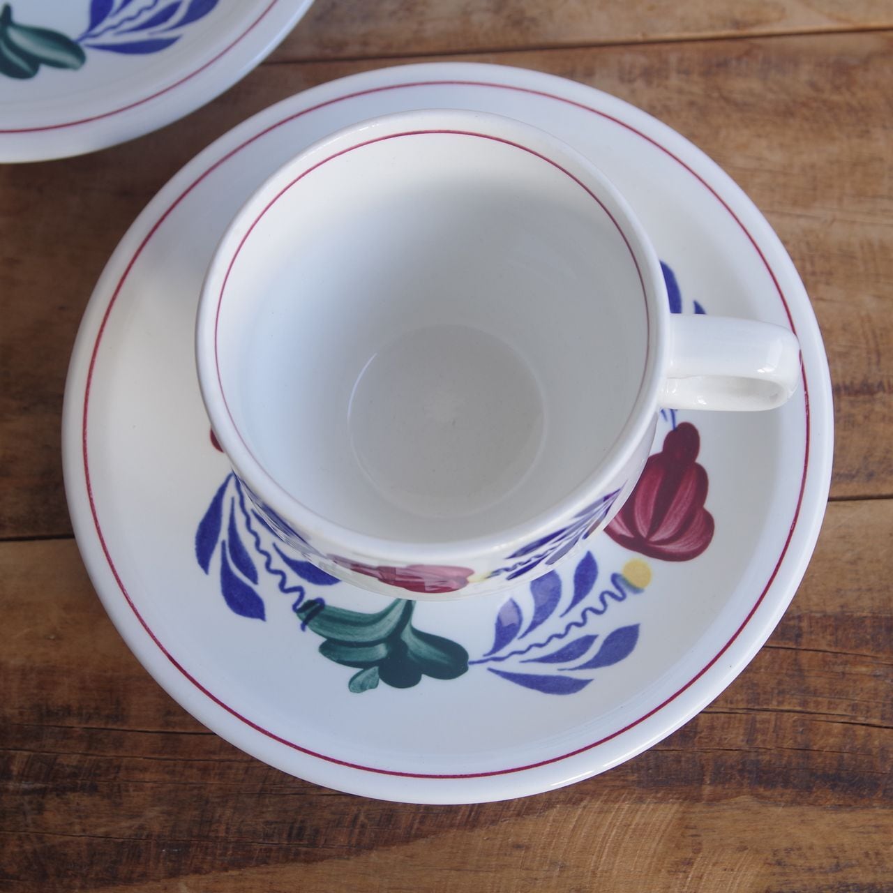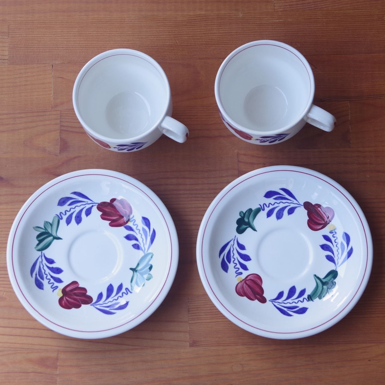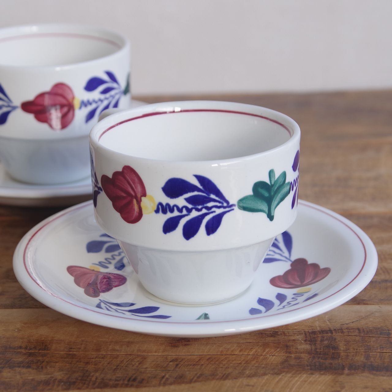 2客セット ペア ベルギー製 ボッホ ベーレンボント Boch Boerenbont 手描き 花柄 スタッキング コーヒーカップ&ソーサー #251116-1 ヴィンテージ 食器 陶磁器 Belgium レトロ ティーカップ ロイヤルボッホ 赤 青