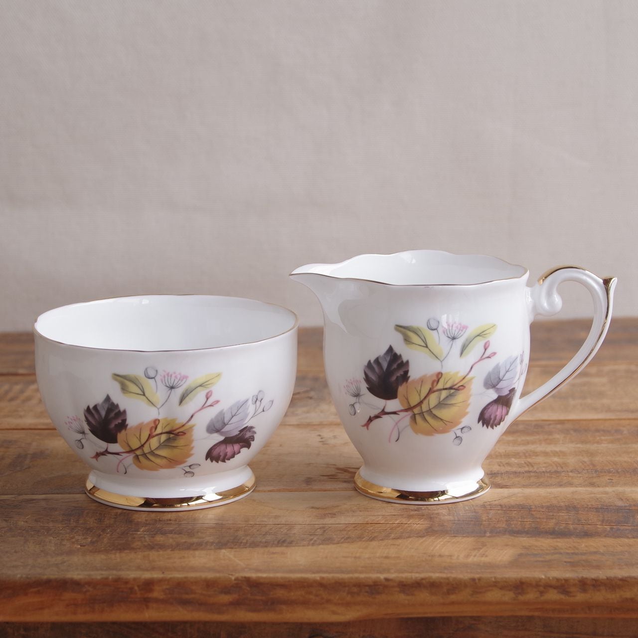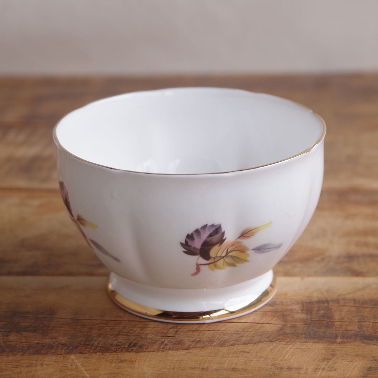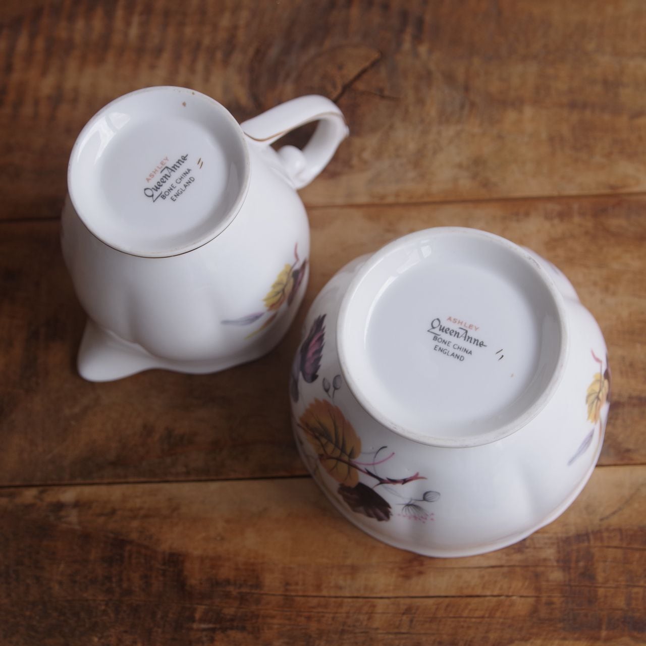 クィーンアン アシュリー シュガーボウル クリーマー Queen Anne Ashley #251126 イギリス ヴィンテージ 食器 陶器 レトロ ゴールド 落ち葉 秋 ボタニカル柄 小鉢 ピッチャー ジャグ アンティーク