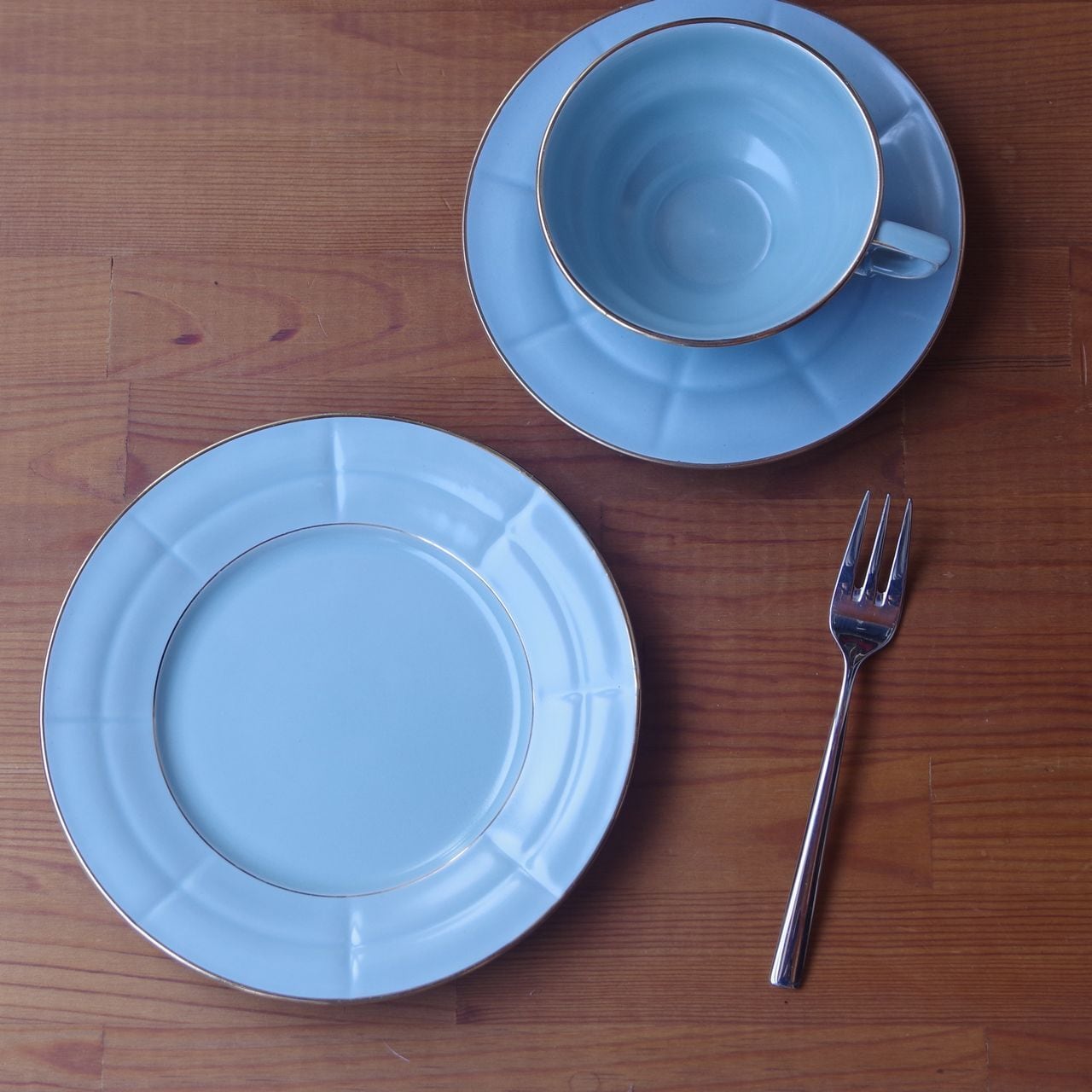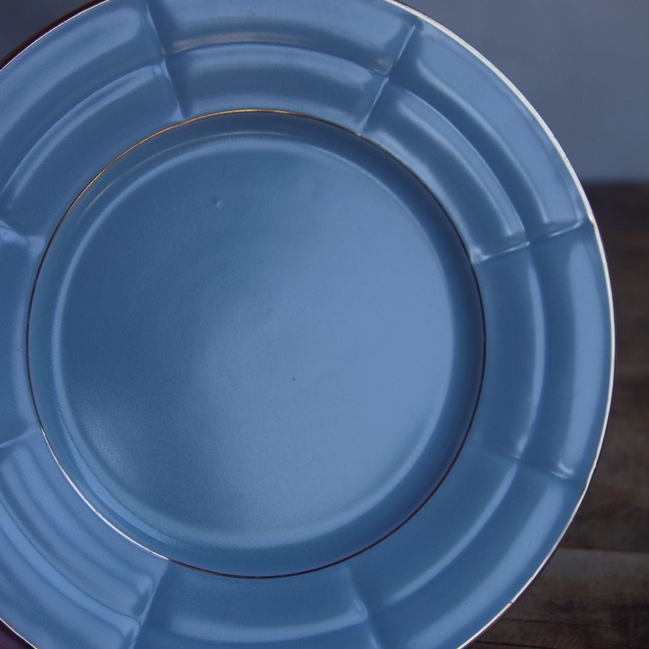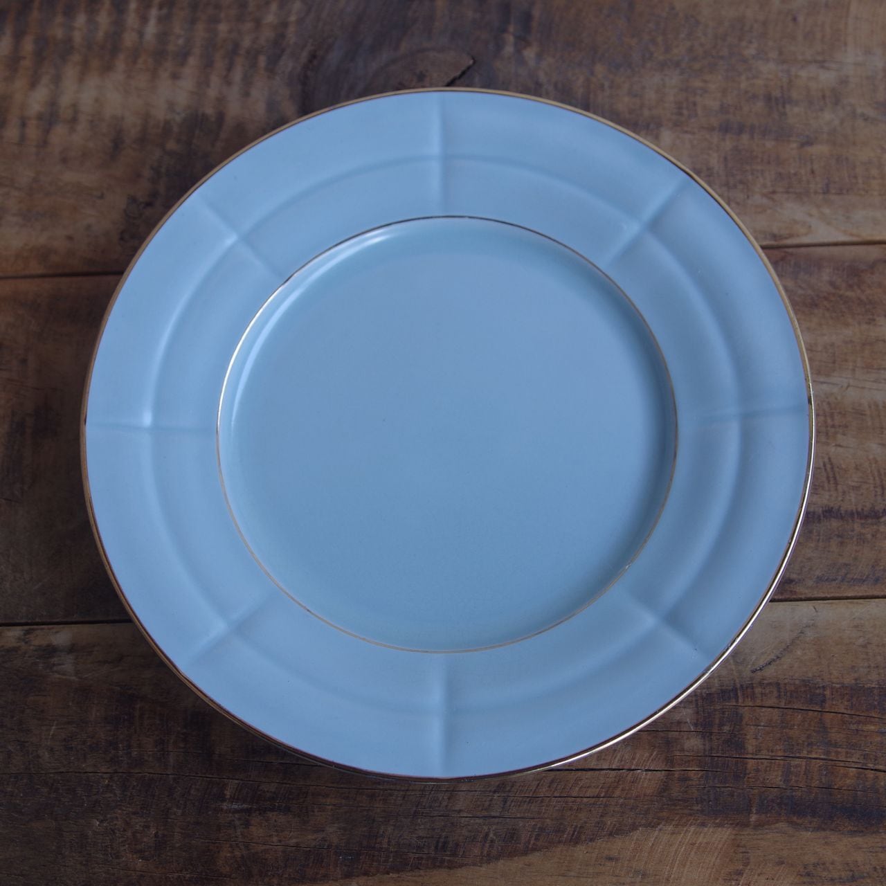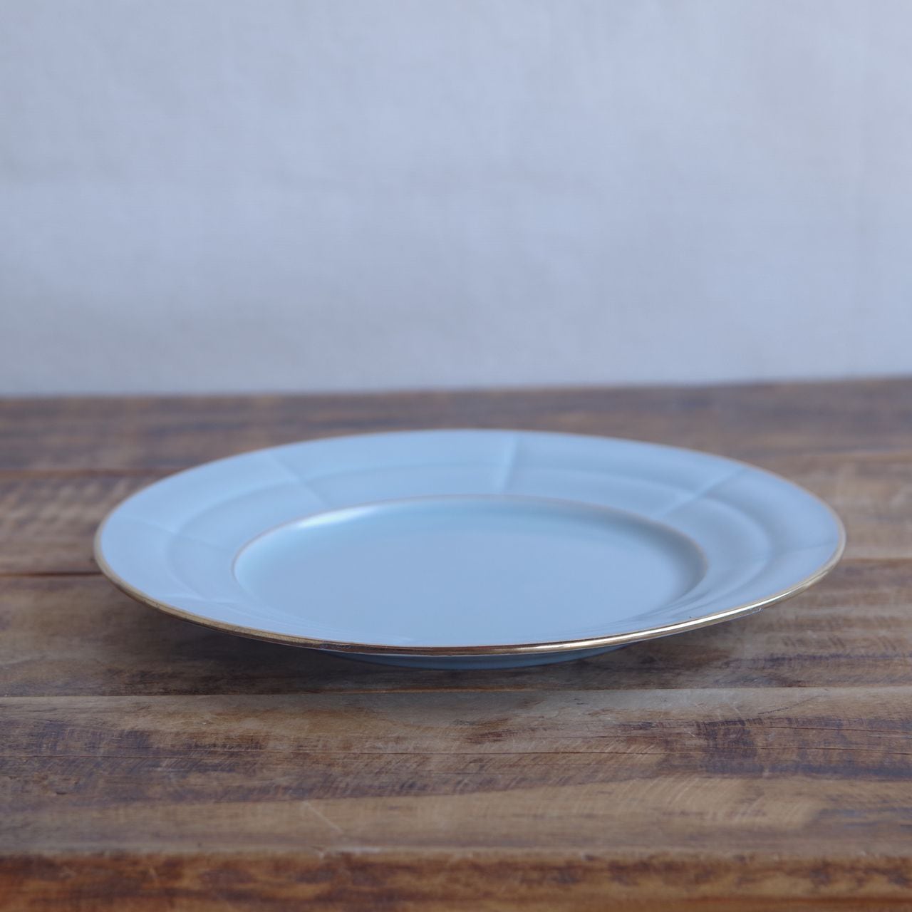淡いブルーでリム部分に溝が入り、ゴールドのふちどりが入ったシンプルなデザインです。