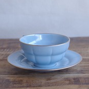 淡いブルーでゴールドのふちどりが入ったシンプルなデザインですが、側面が絞られたように立体的に造形されており、角ばった持ち手の部分にもデザインのこだわりが見て取れます。