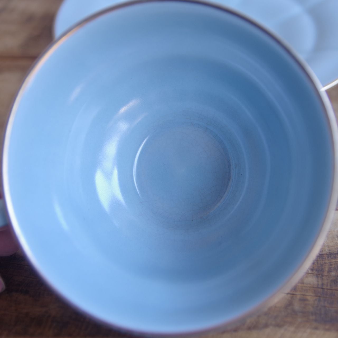 カップの内側やソーサー中央付近に、貫入と思われるひび割れが見えます。