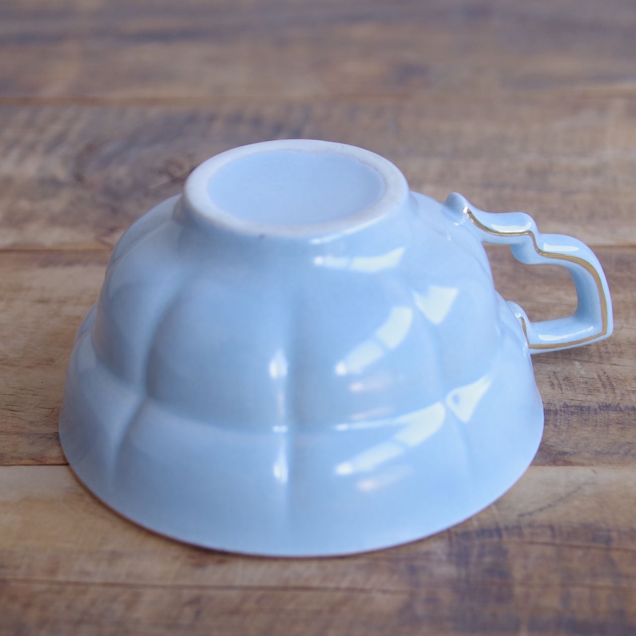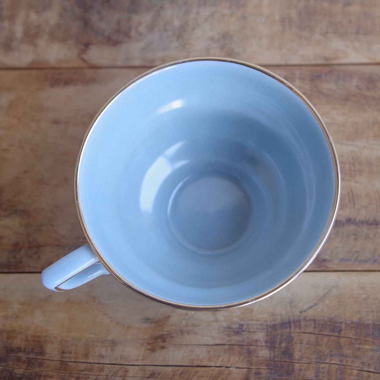 淡いブルーでゴールドのふちどりが入ったシンプルなデザインですが、側面が絞られたように立体的に造形されており、角ばった持ち手の部分にもデザインのこだわりが見て取れます。
