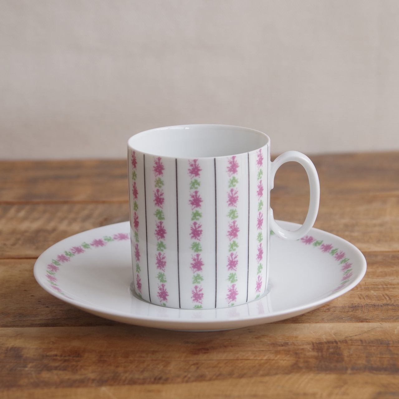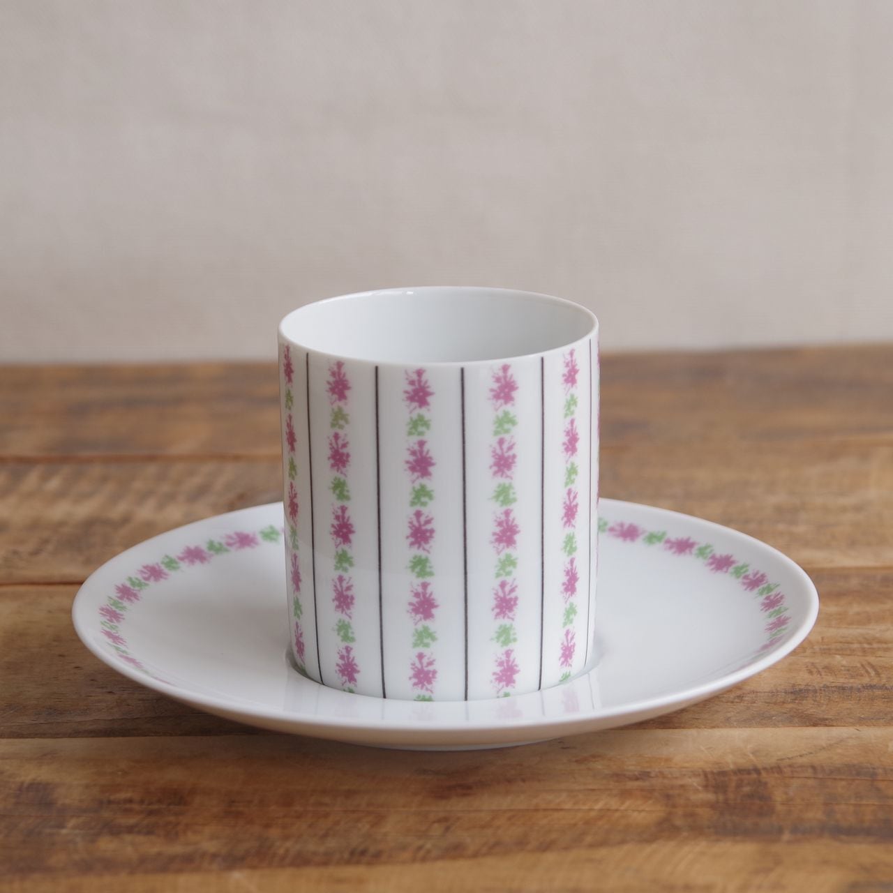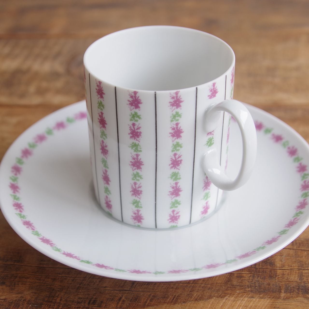 Medalion というシリーズのもので、寸胴のカップに、ピンクの花のような模様やラインが入っています。