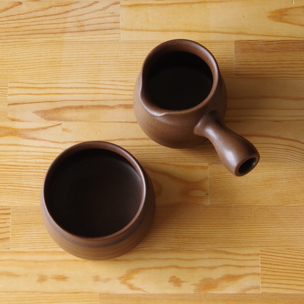 どっしりと安定感のある形で、全体がマットなダークブラウンの釉薬で塗られています。
