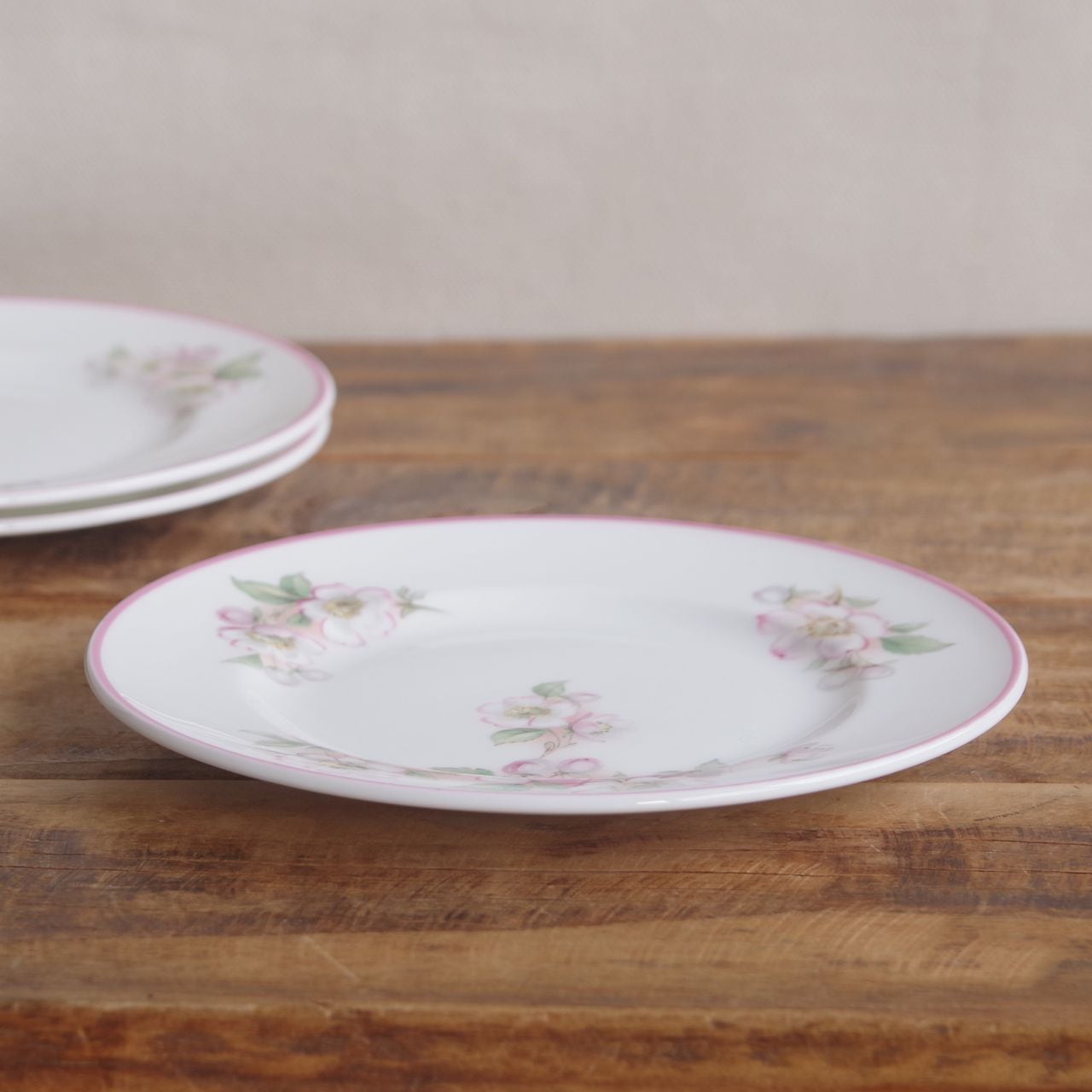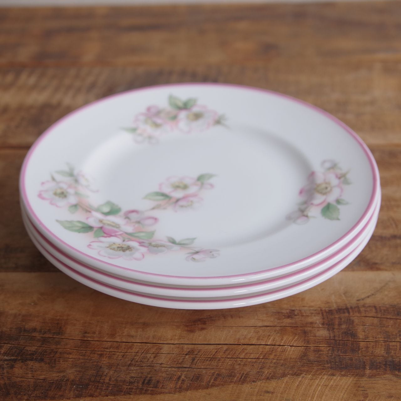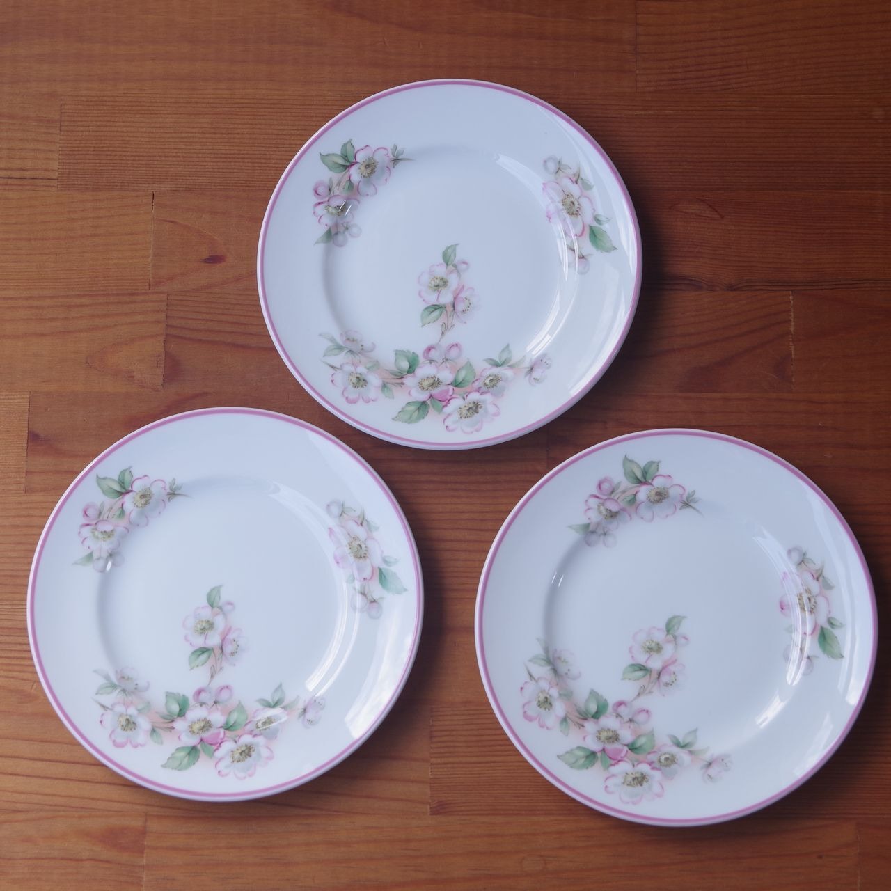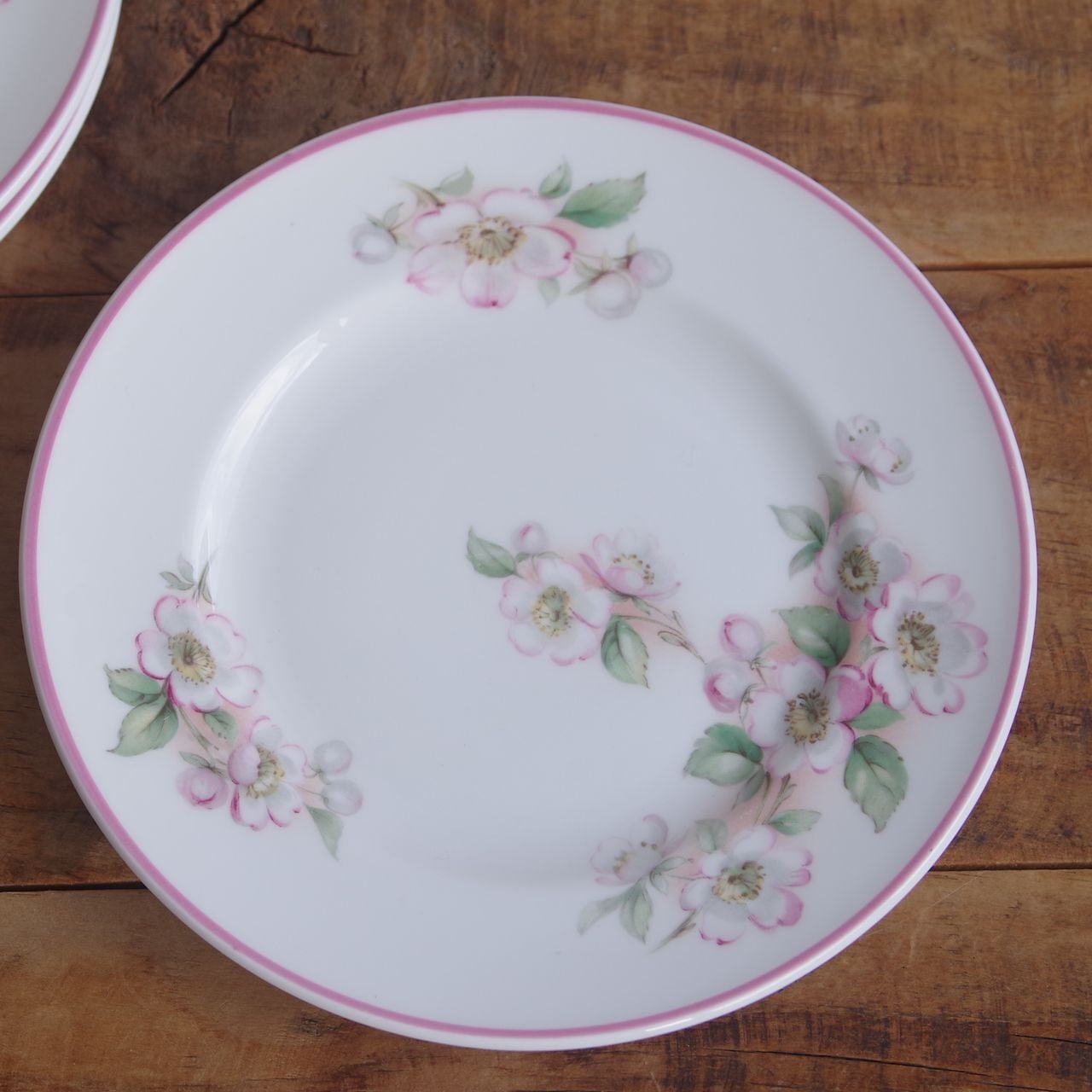 りんごの花をつけた(桜かもしれません)枝の絵柄が描かれ、リム部分にはピンクのラインが入っています。