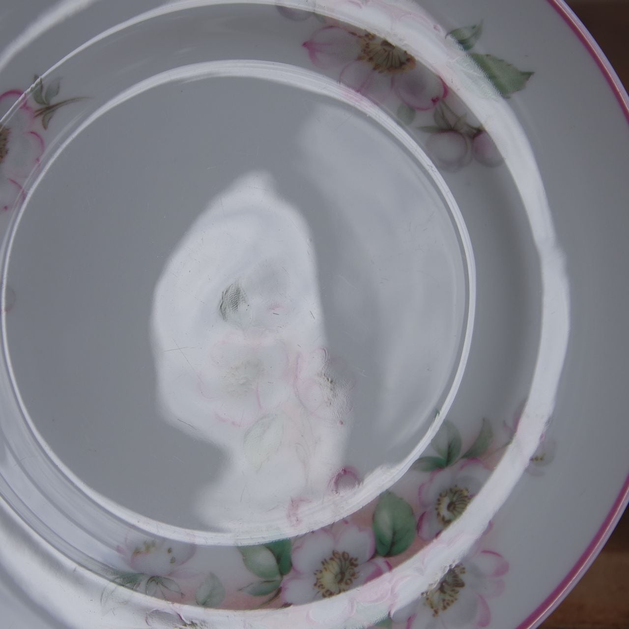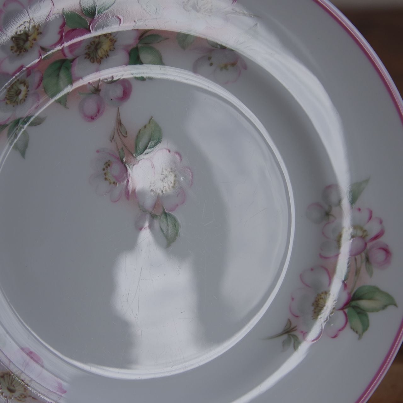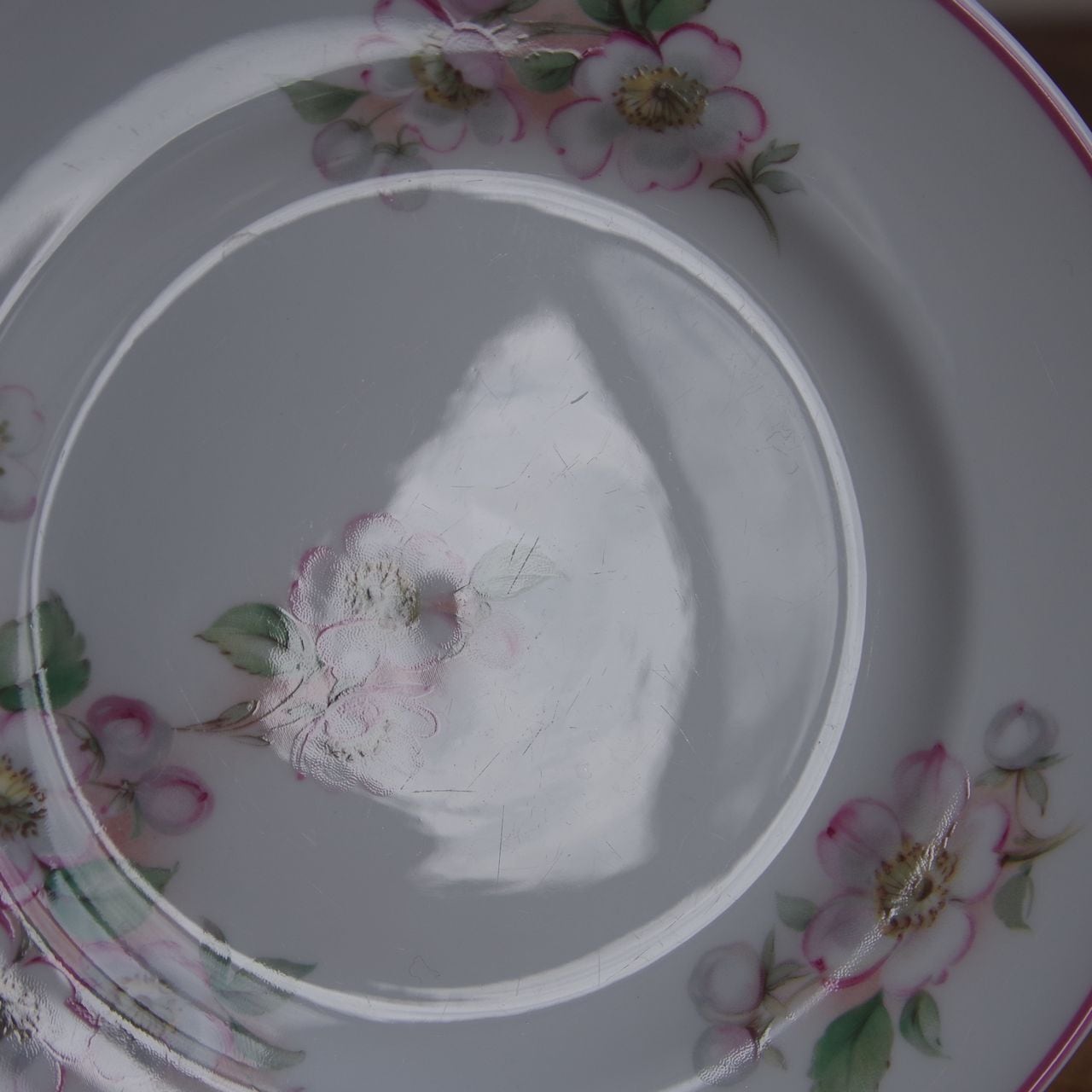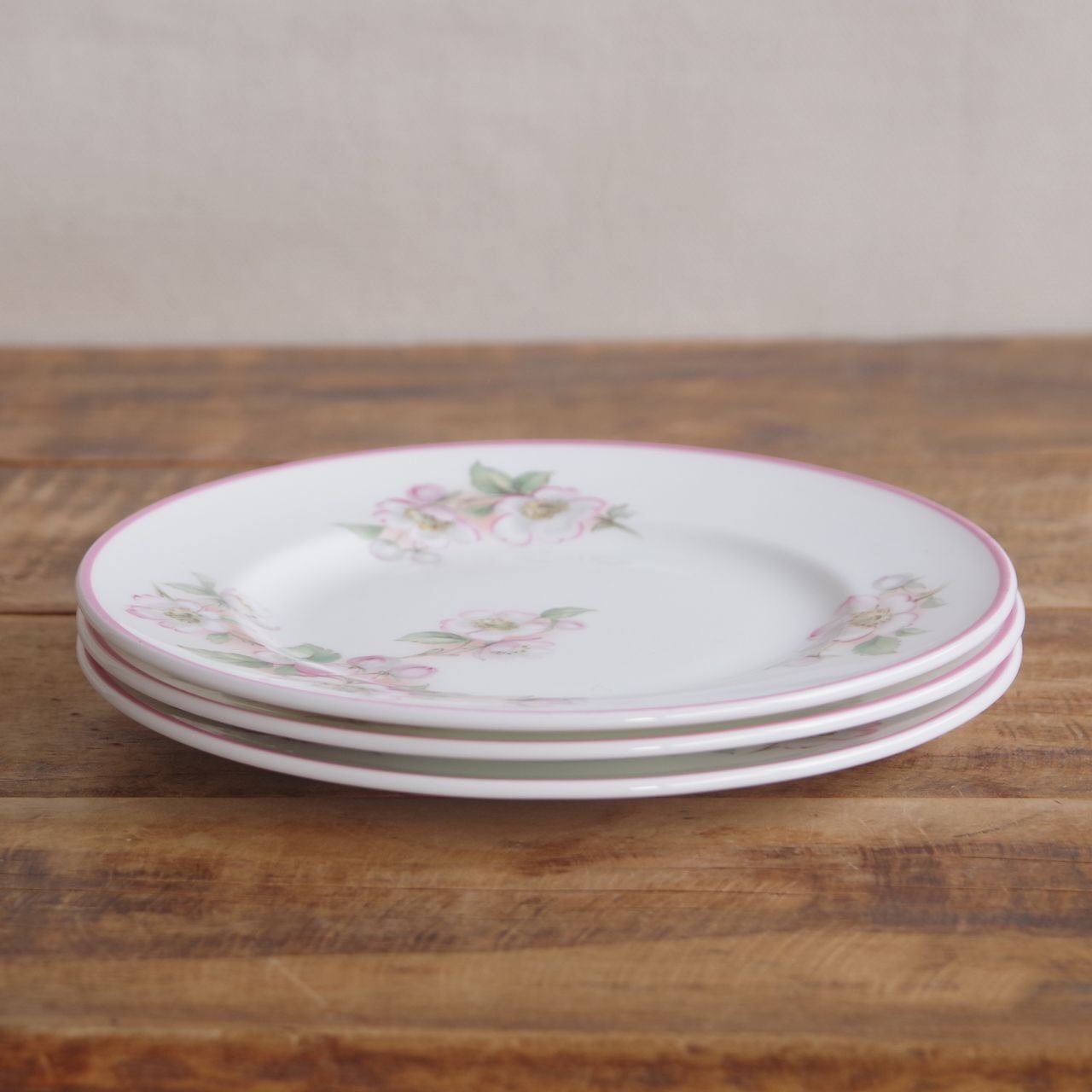りんごの花をつけた(桜かもしれません)枝の絵柄が描かれ、リム部分にはピンクのラインが入っています。