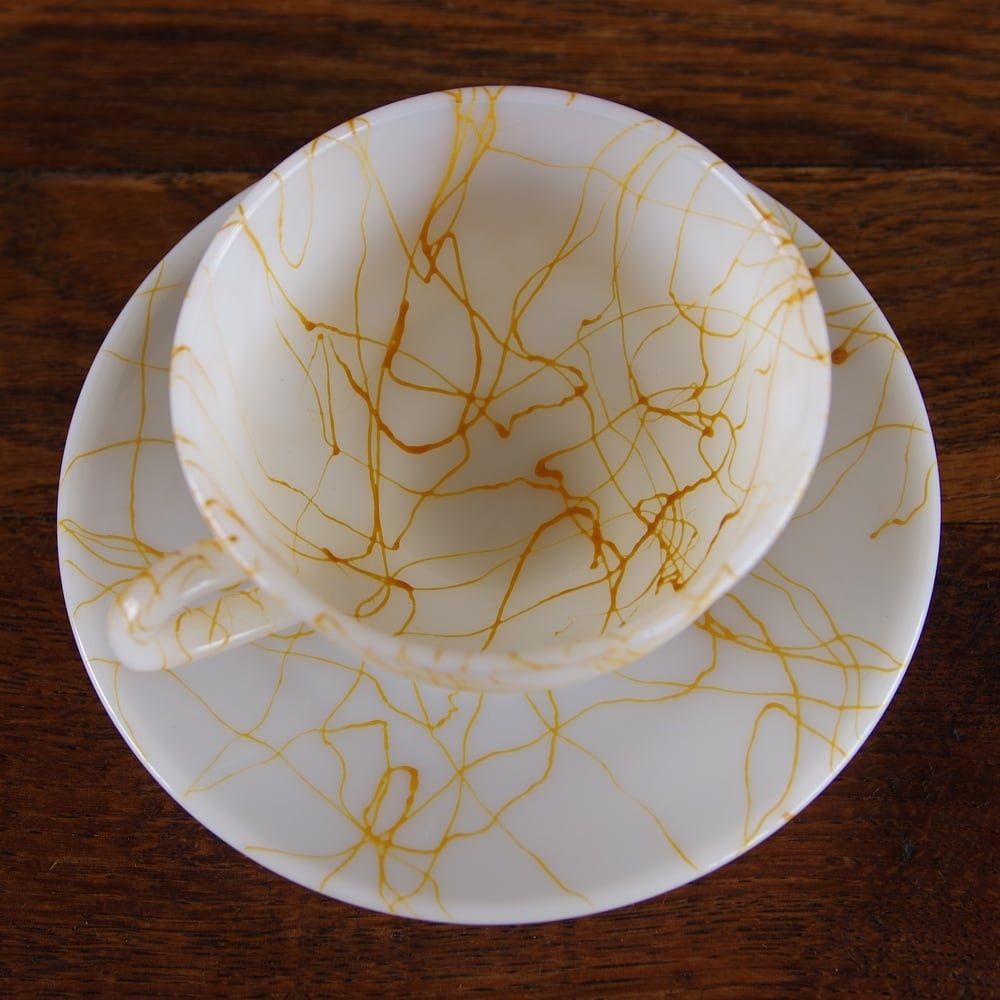 白いガラスに、オレンジ色のランダムなラインがマーブル模様のように入っています。
