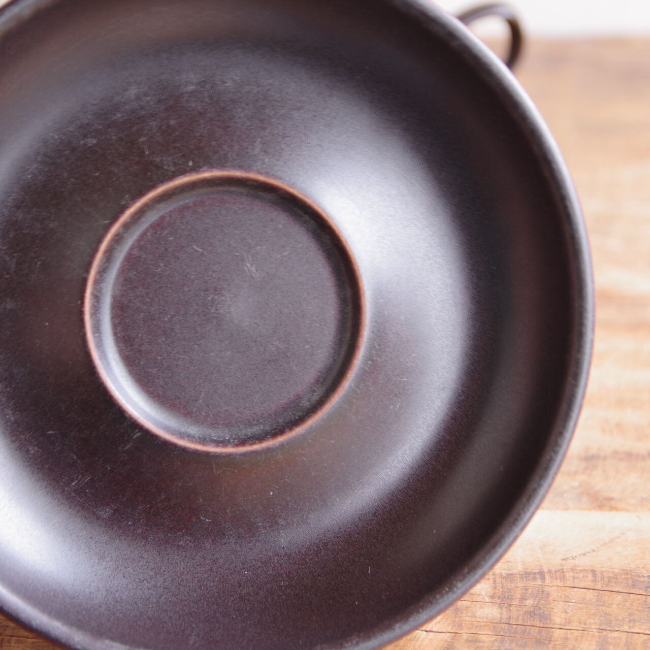 カップの側面に、黒に近いこげ茶色の釉薬がかかっており、手描きの薔薇のような花の絵柄が白抜きされています。