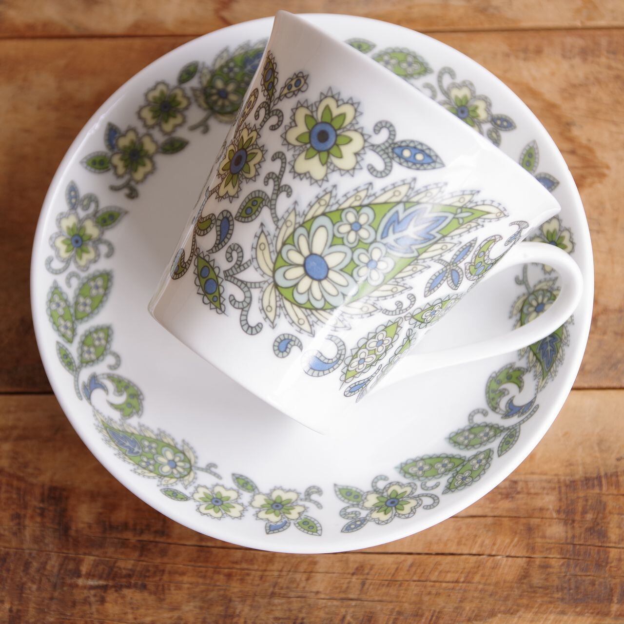 グリーン色を基調に、ペイズリー柄のような花の絵柄が入っています。
