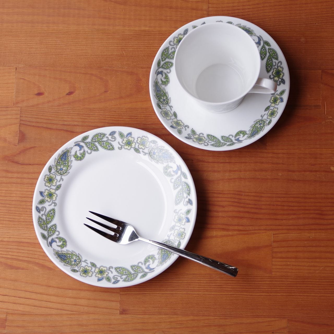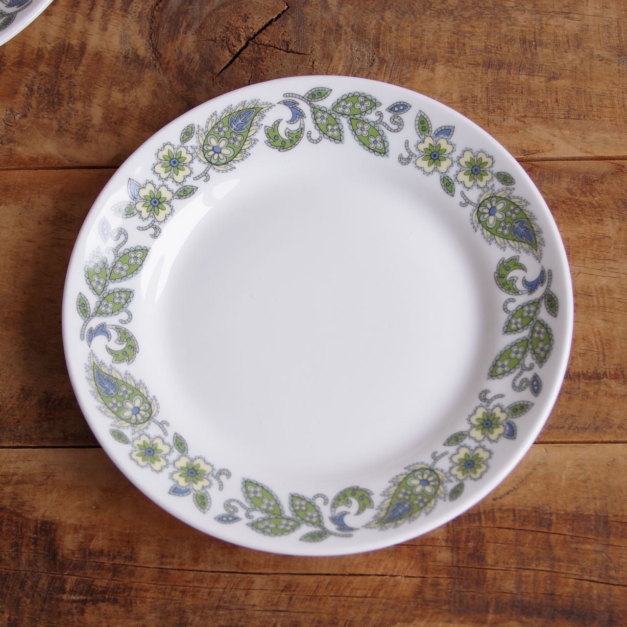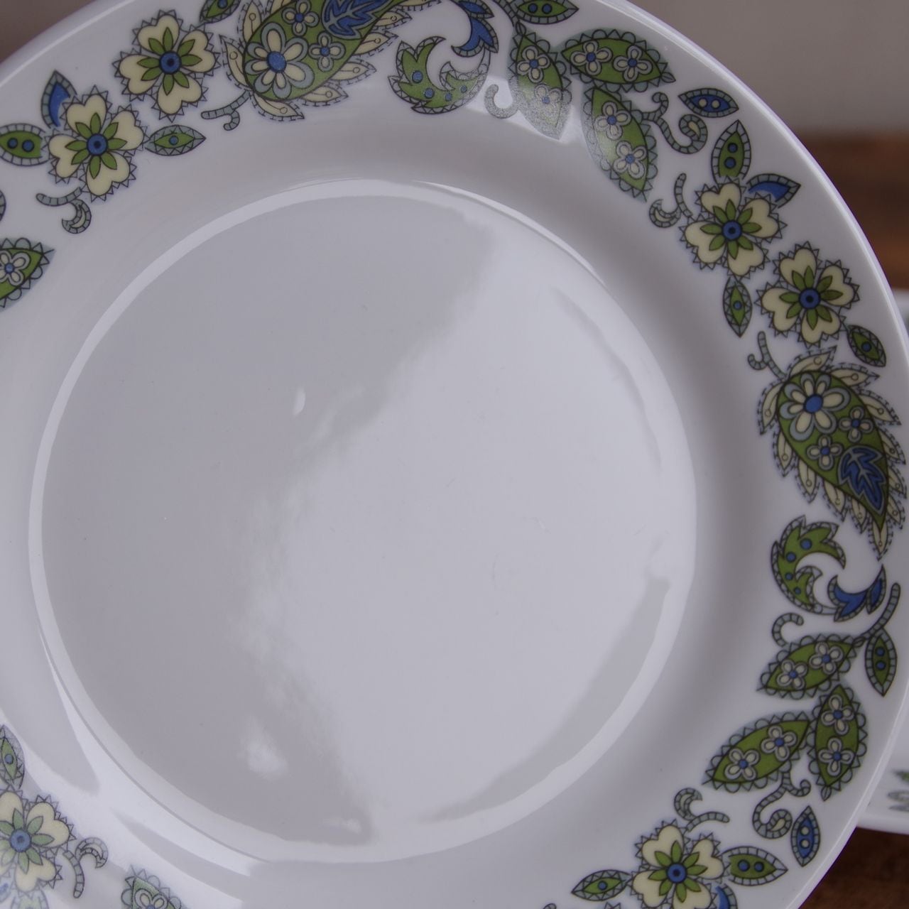 リム部分に、グリーン色を基調としたペイズリー柄のような花の絵柄が入っています。