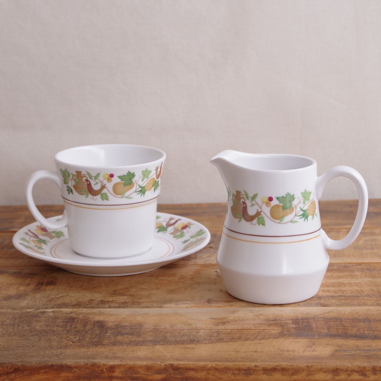 ノリタケ Noritake プログレッション ホームカミング 鳥 フルーツ柄 クリーマー ミルク入れ ピッチャー ジャグ #260128 レトロ ヴィンテージ 食器 陶器 Progression Homecoming パイナップル 洋梨 果物カゴ バスケット 蔦 かわいい グリーン