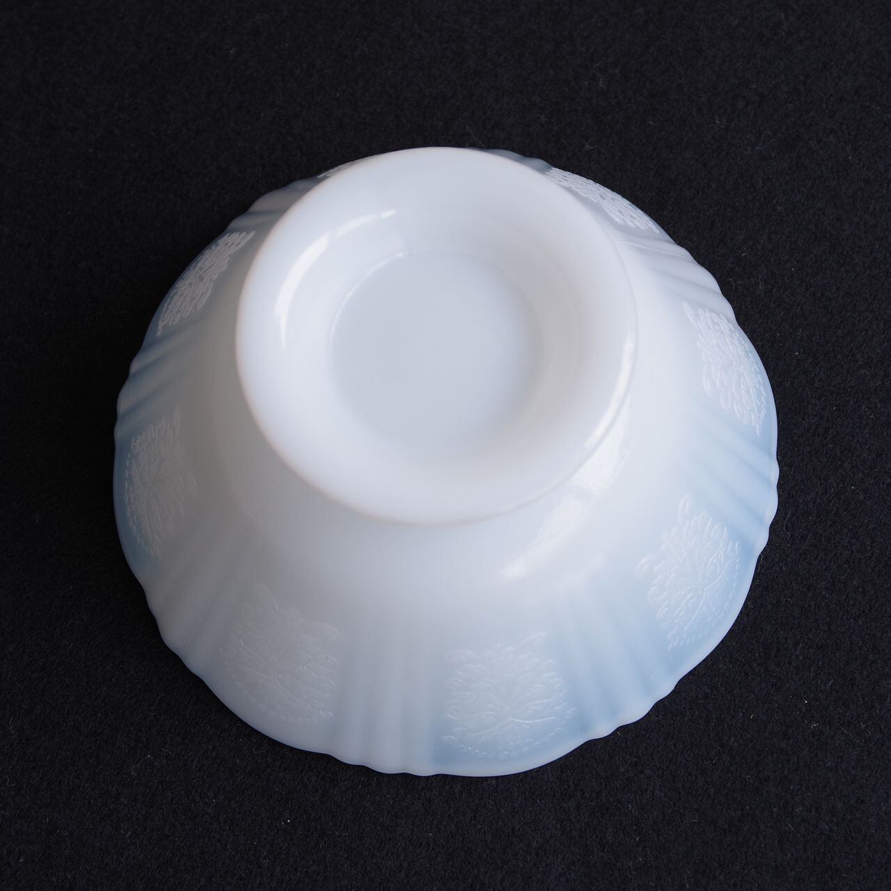 乳白色の薄いガラスで作られており、側面にダマスク柄のような繊細なレリーフが入っています。