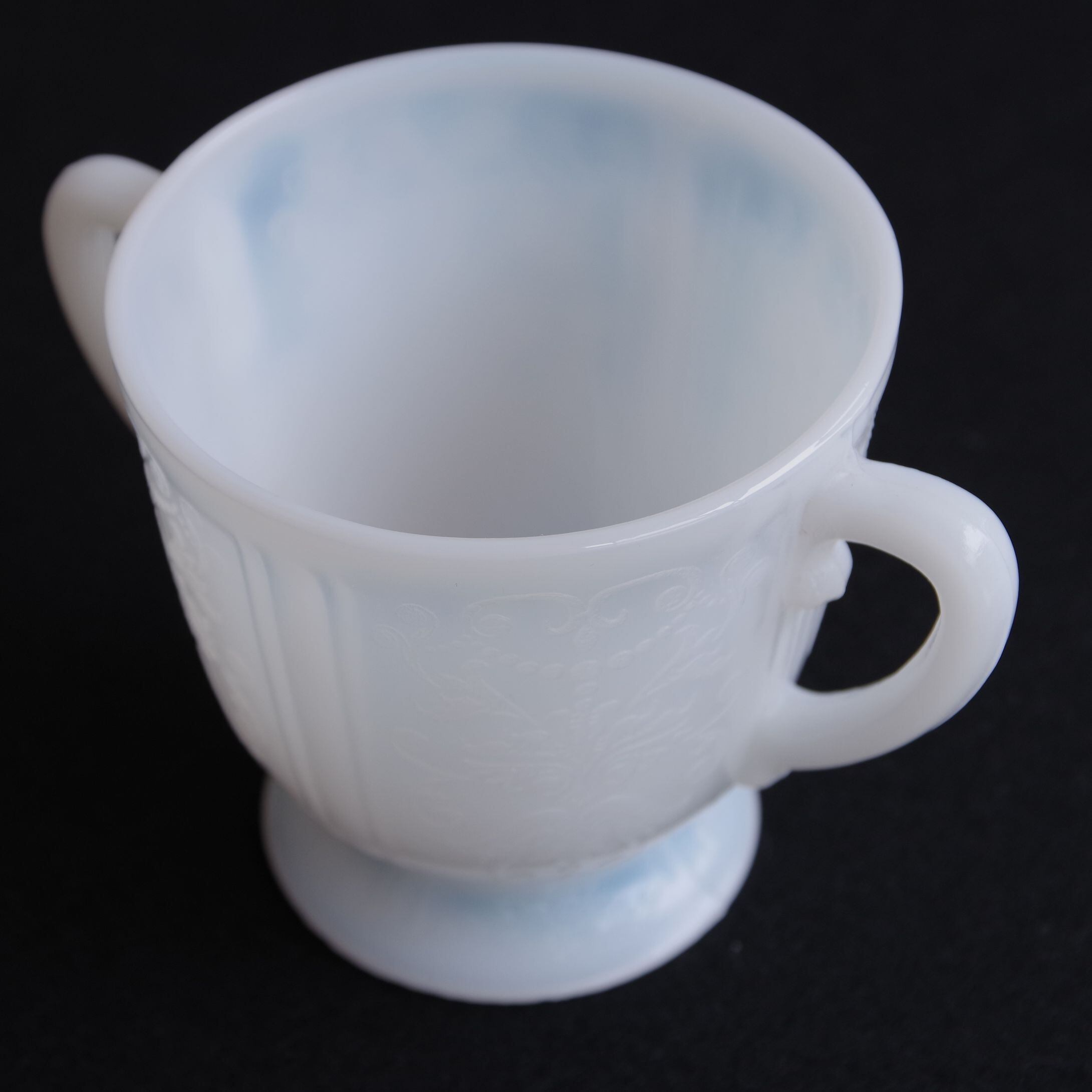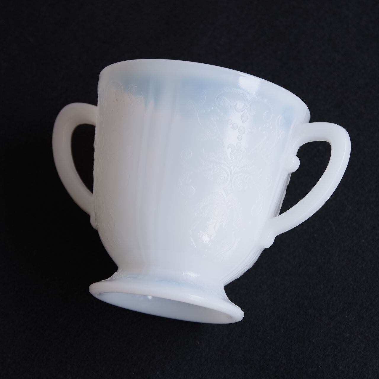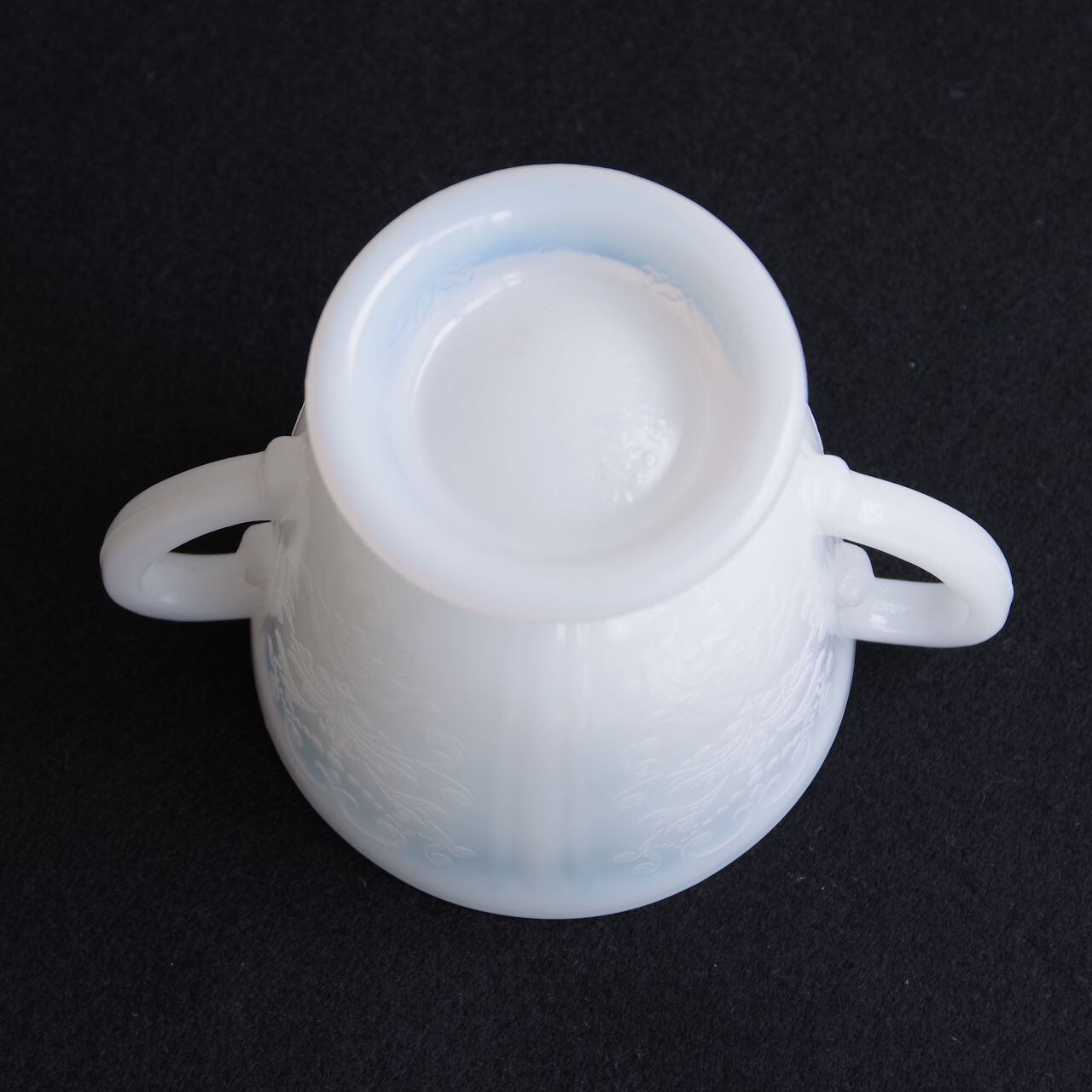 白いガラス製で、側面や底面に、ダマスク柄のような繊細なレリーフが入っています。