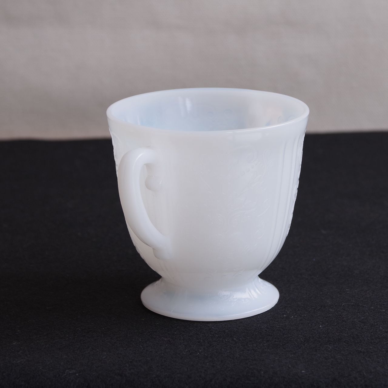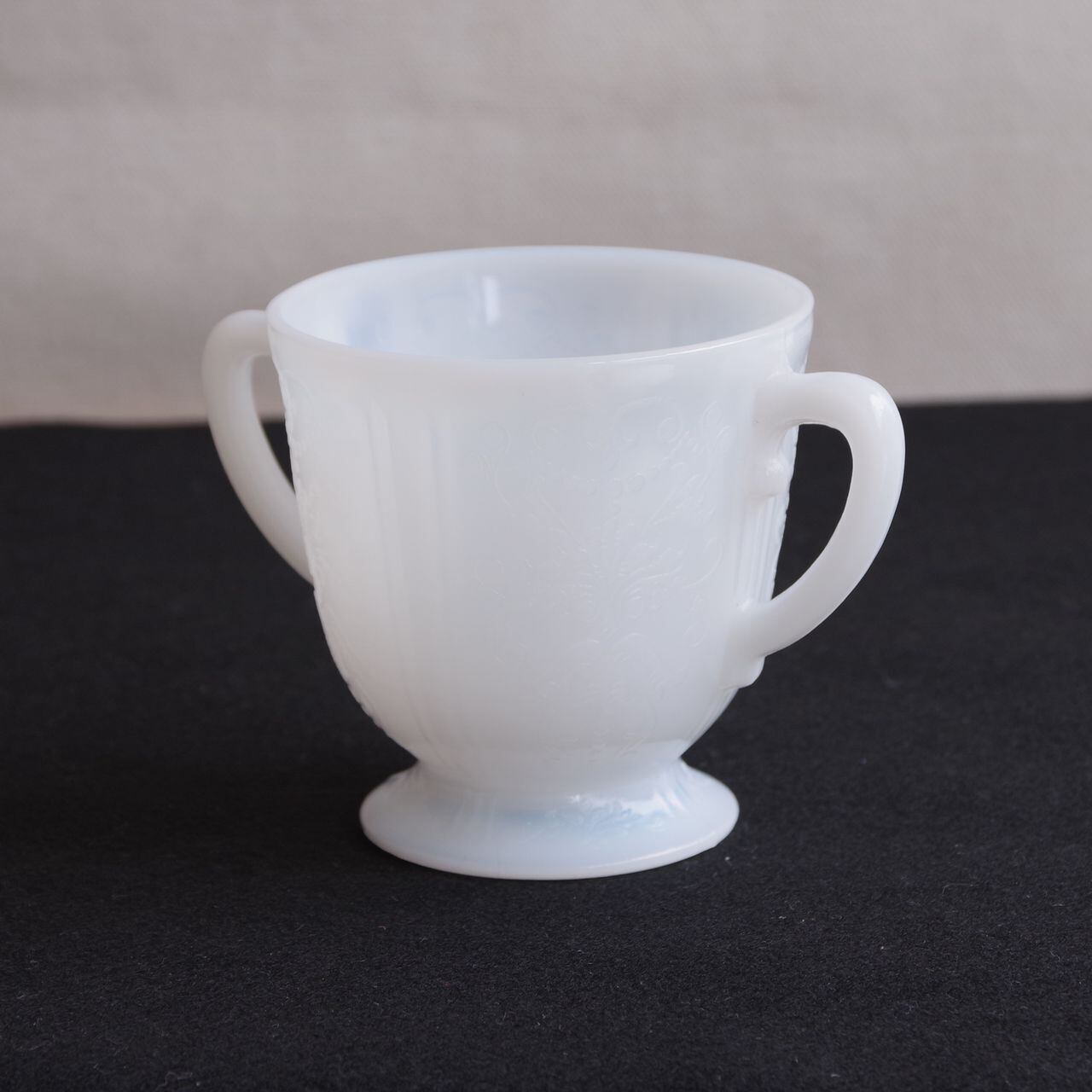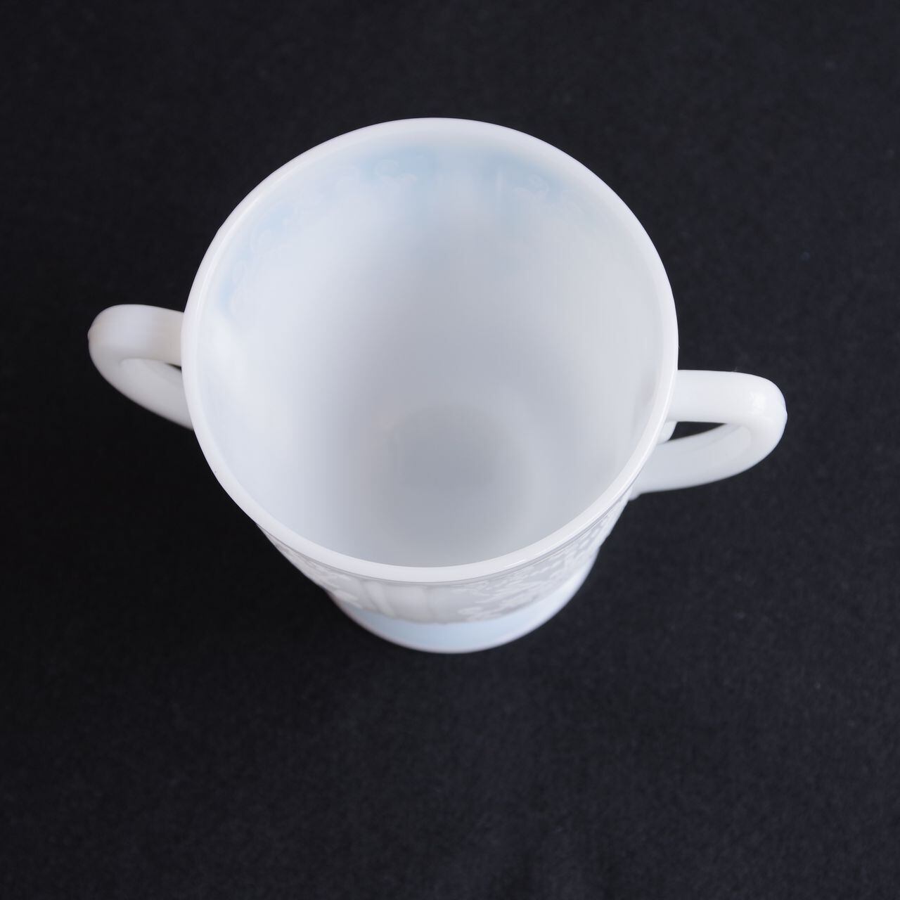 白いガラス製で、側面や底面に、ダマスク柄のような繊細なレリーフが入っています。