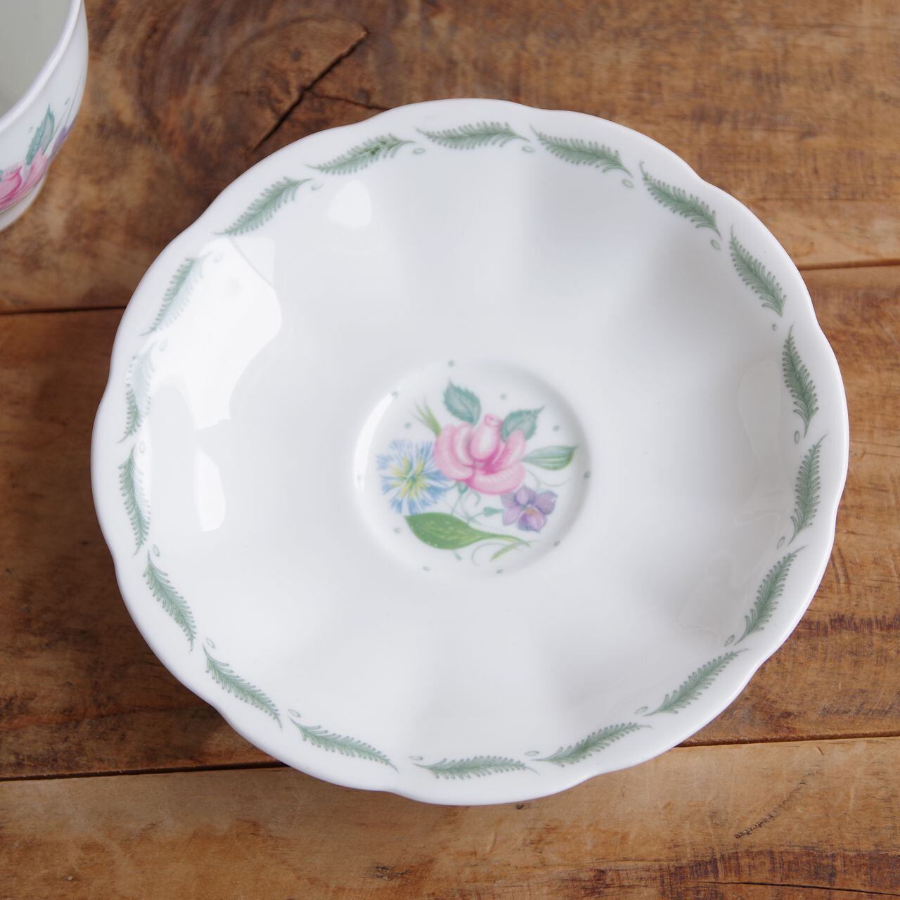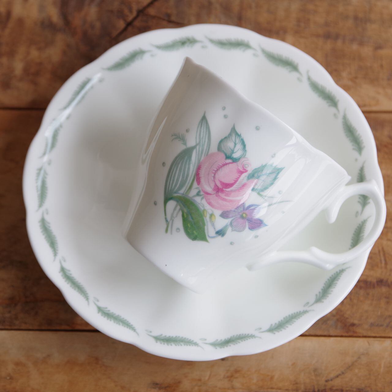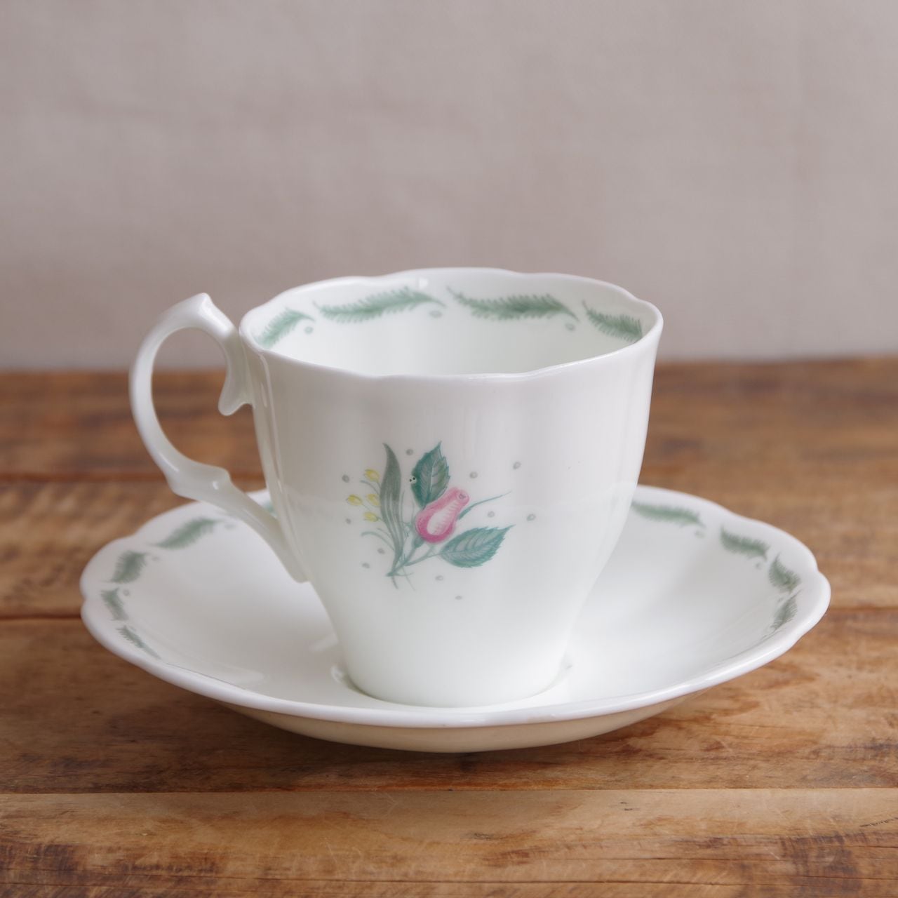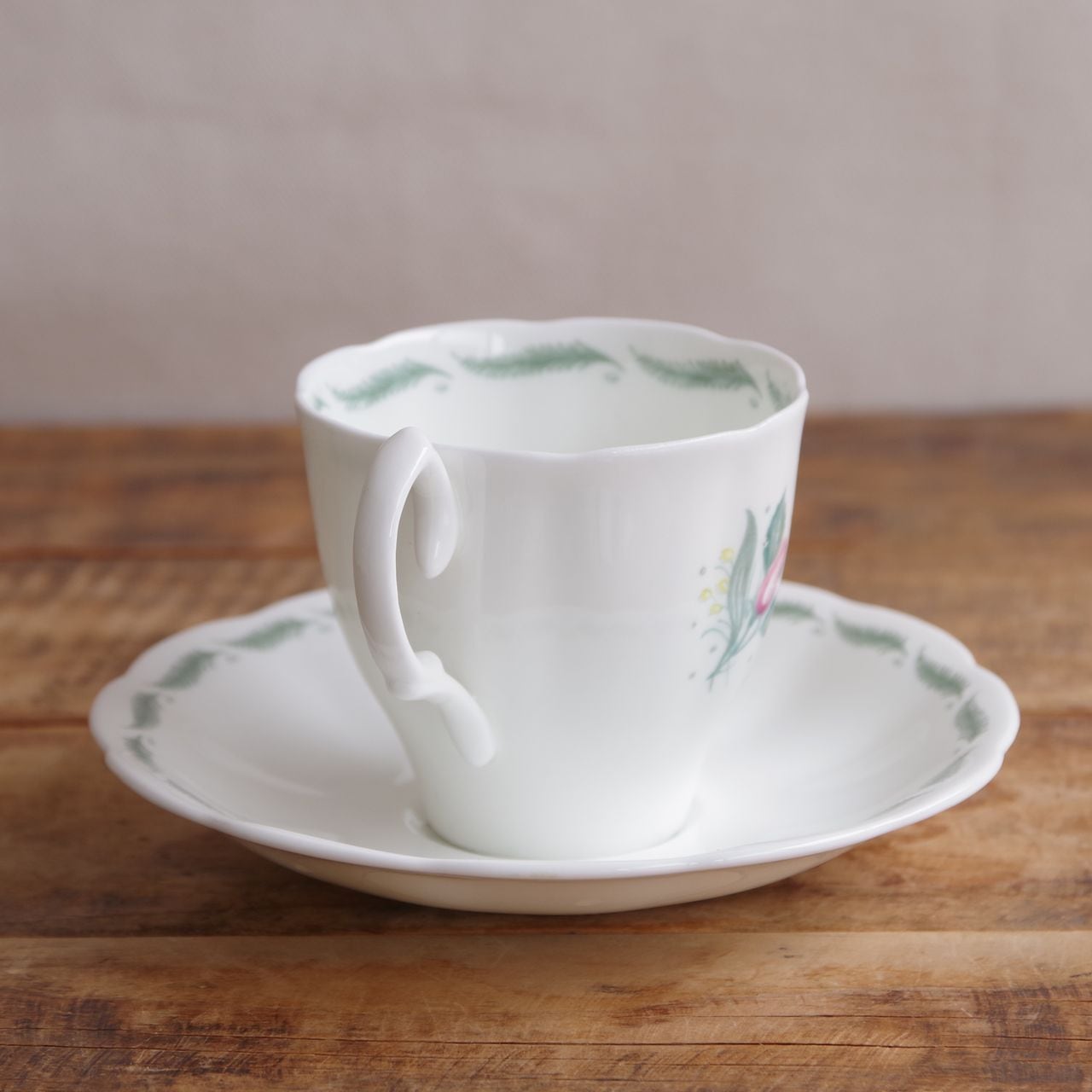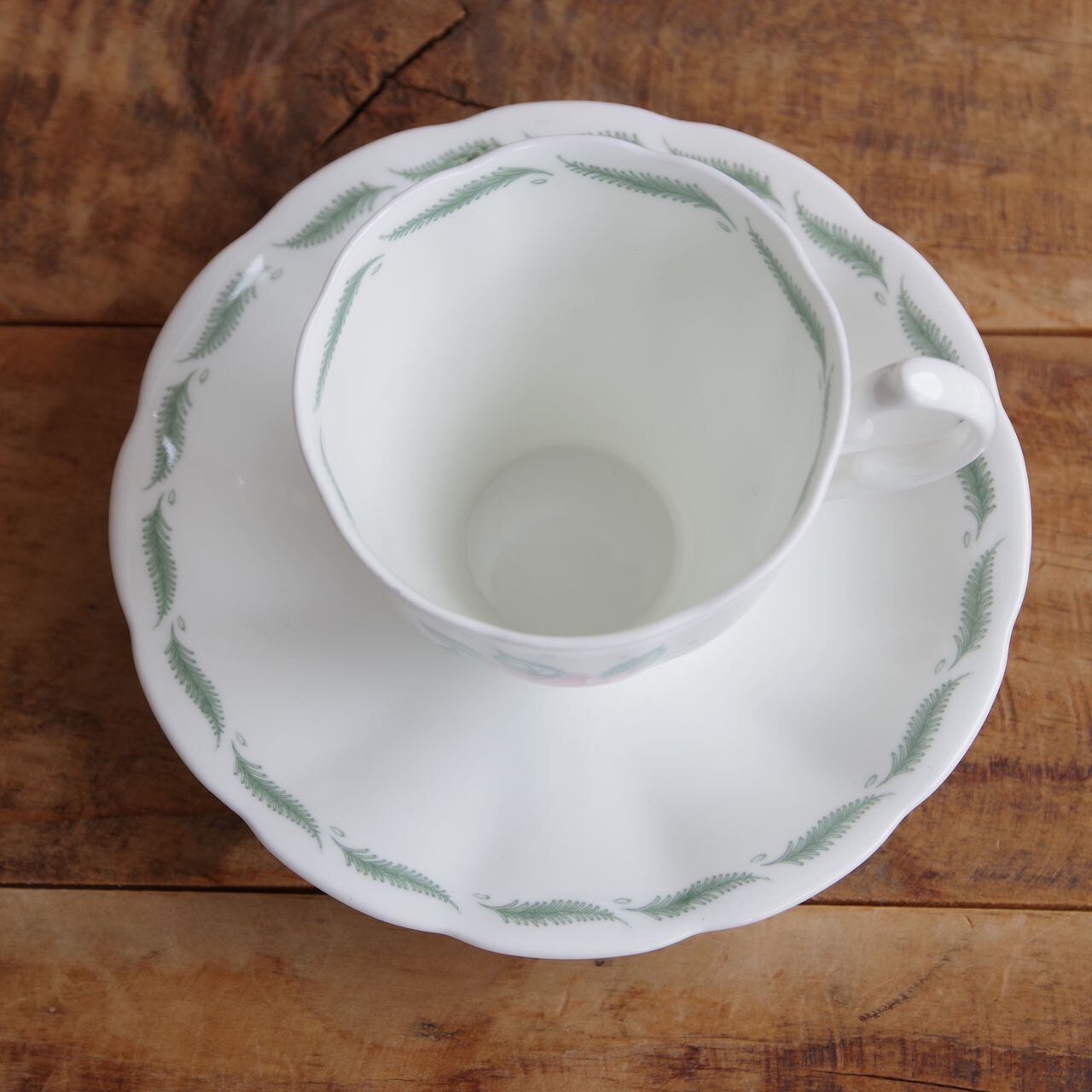ソーサーのふちとカップのふち(内側)には、グリーンの羽のような葉が描かれています。