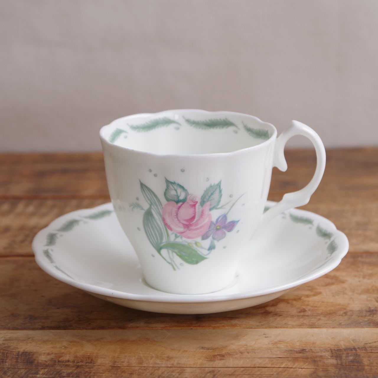ピンクのバラと、紫のスミレの花の絵柄が入った、やわらかい色合いのかわいらしいカップです。